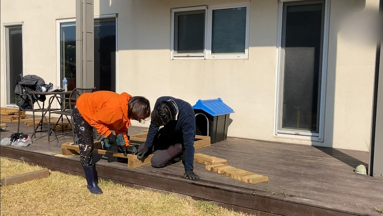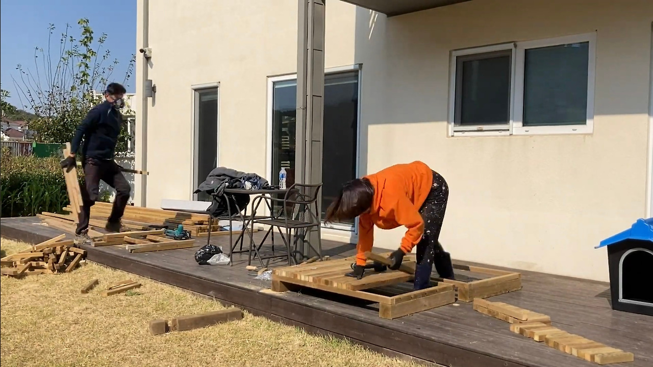 남편이지만 일할 때는 현장의 동료 같은 마음이 든다. 손발이 딱딱 맞고 죽이 척척 맞는 환상의 복식조. 한 쪽에서는 계속 나무를 자르고 다른 쪽에서는 그 나무들을 피스로 연결해서 판으로 만들었다.