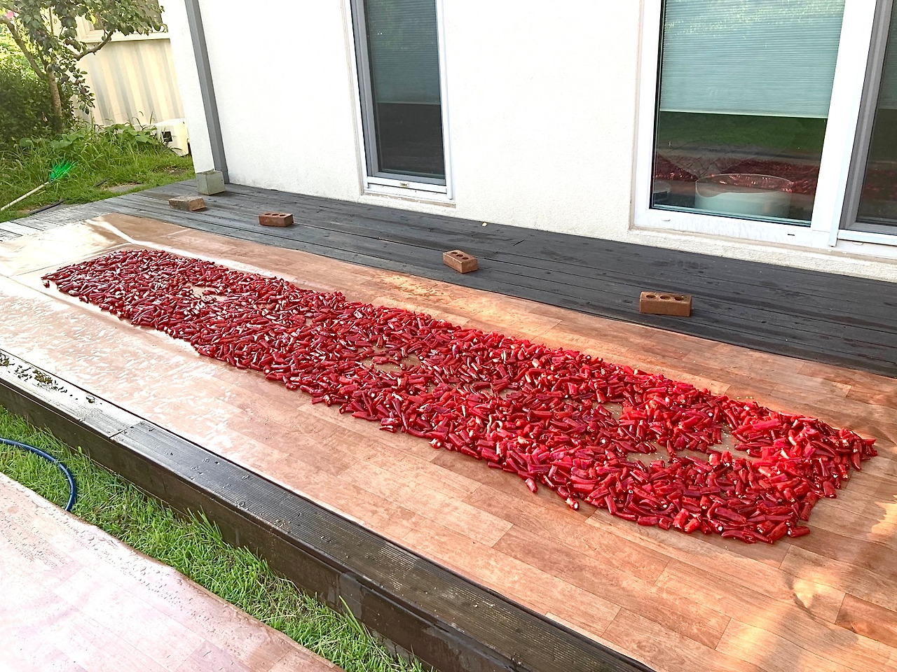 고춧가루를 만들려면 수확한 고추를 말려야 했다. 이웃분들이 ‘와서 우리집 고추 건조기 써~.’라고 해주셨지만 “저 태양초 만들어 보려고요!”라고 자신만만하게 외쳤다. 그런데 농사 선배님들이 고추 건조기 쓰실 때는 다 이유가 있는 거였다. 첫 번째 딴 고추는 햇볕에 말리면서 태양초를 만들어 보려 하다가 곰팡이가 피었다. 태양 아래에서 말린다고 쉽게 태양초가 되는 게 아니었다. 두 번째부터는 이웃분들의 도움을 받아 건조기에서 고추를 말렸다. 수분 가득했던 아삭한 고추가 종이처럼 얇아져서 돌아왔다. 바스락바스락 반 투명하게 잘 마른 고추 안에 금빛 씨앗이 굴러다니고 있었다.
