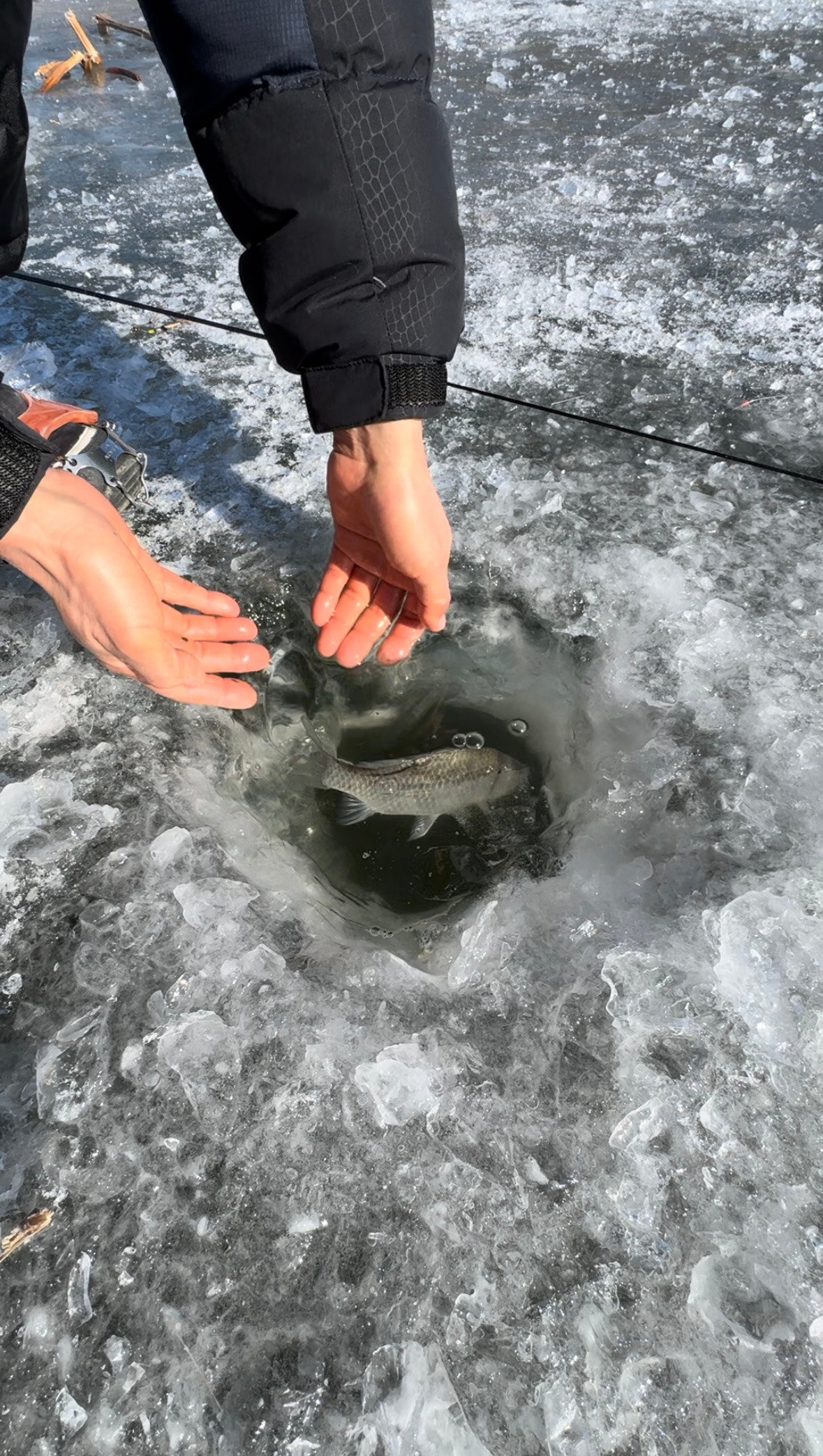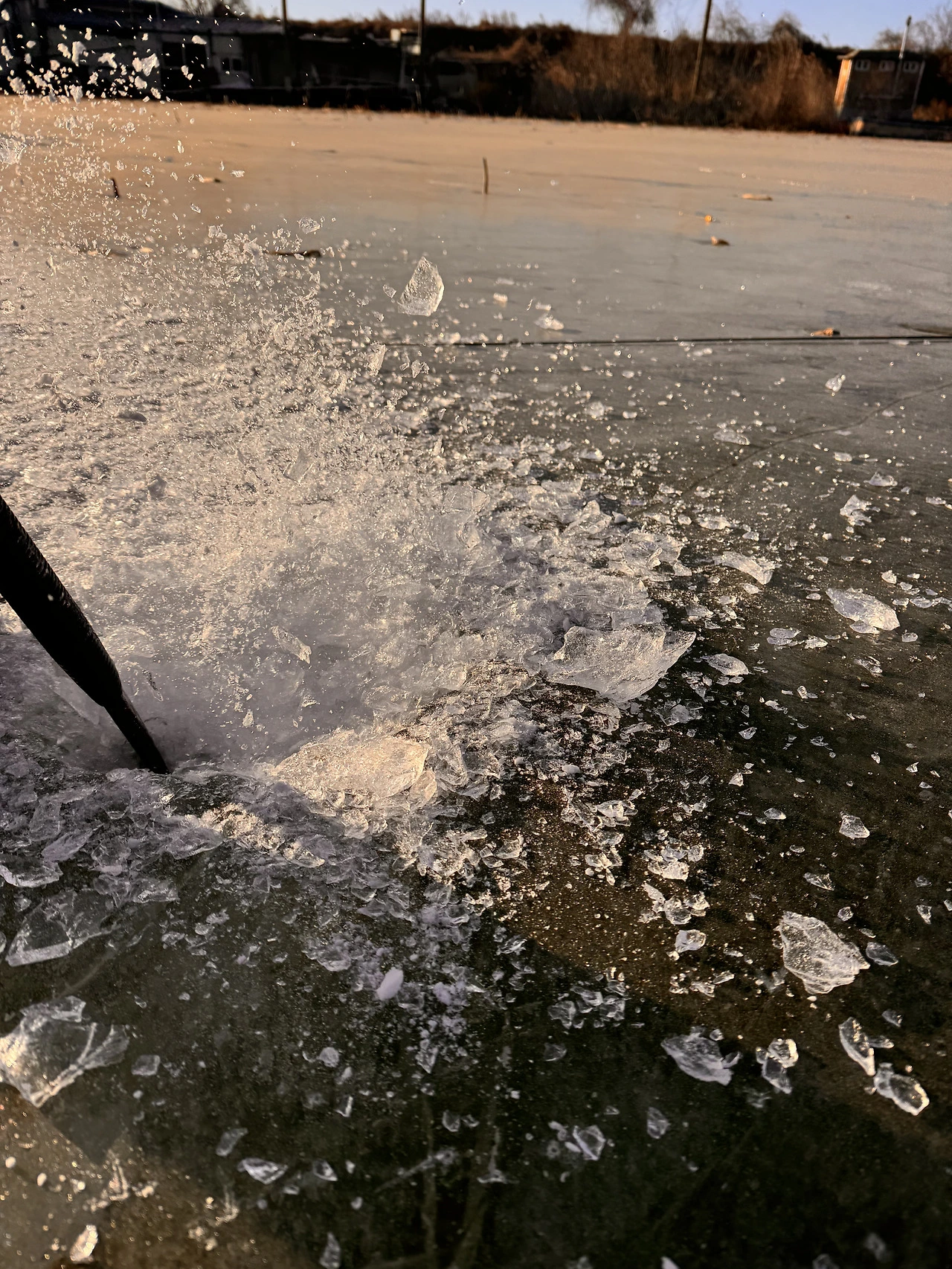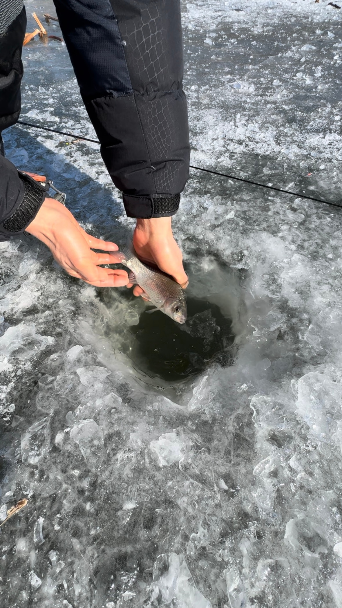 겨울 낚시는 시작부터 특별하다. 일단 얼음부터 뚫고 시작한다. 구멍 크기는 발보다 작아야 한다. 낚시가 끝나고 시간이 지나면 살얼음이 껴서 뚫려 있다는 게 보이지 않는다. 크기가 클 경우 다른 사람이 다니다가 발이 빠질 수 있기 때문에 지름은 붕어만 나올 수 있을 정도로 작게 한다. 낚시하는 사람들끼리 하는 서로를 위한 배려다.
