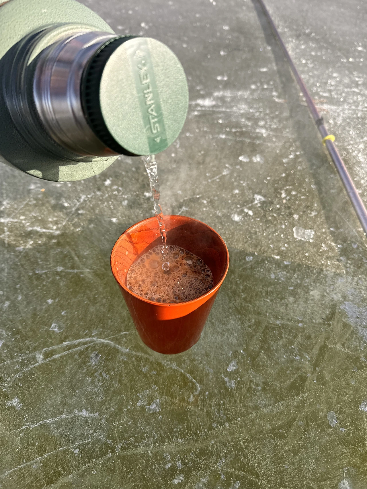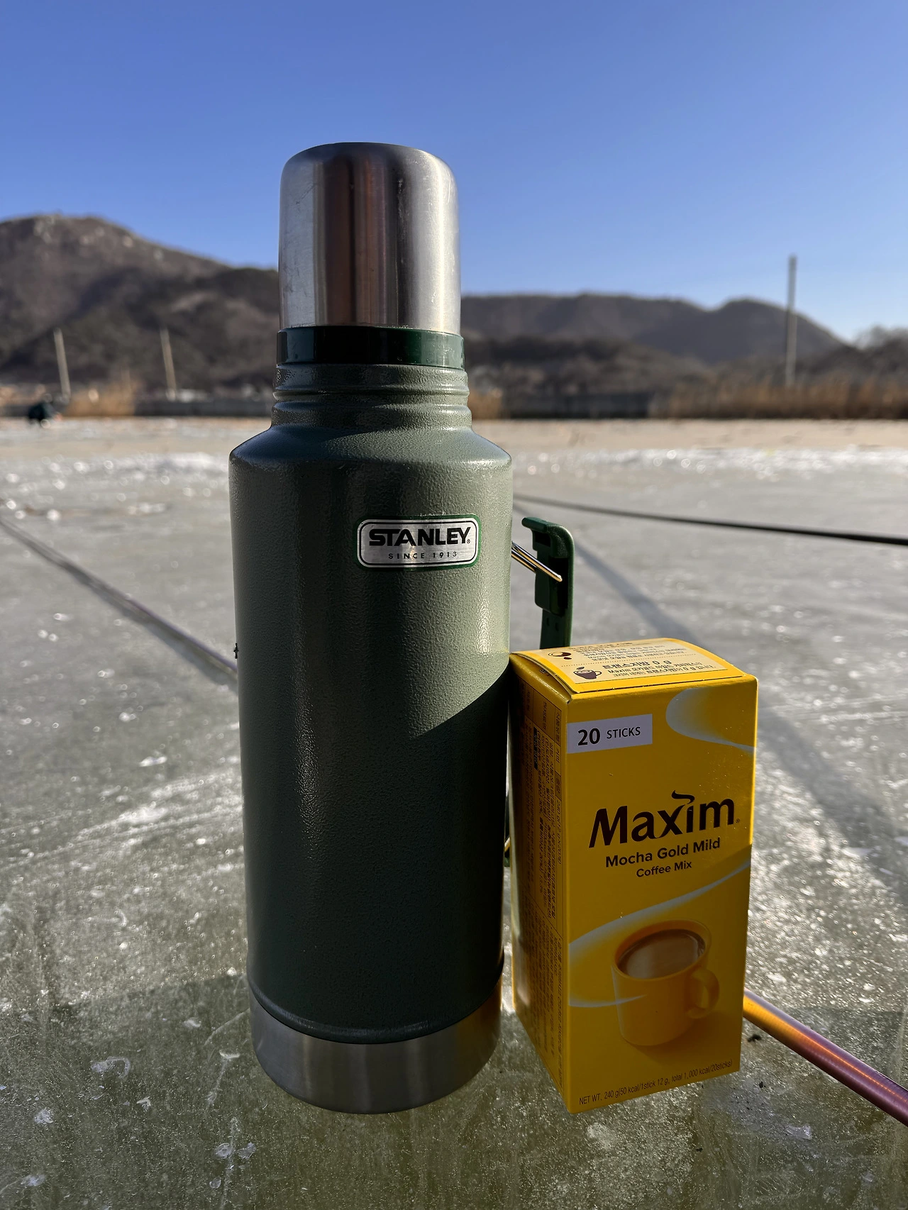 텀블러에 담아온 뜨거운 물로 믹스커피를 탔다. 저수지에 달달한 커피향이 퍼졌다. 따끈한 커피가 들어가니 차가웠던 목이 찌르르 녹는 것 같았다. 평소엔 마시지도 않는 믹스커피인데, 낚시 와서 마시면 혀에 착착 감긴다. 프림의 고소한 맛이 황홀했다.