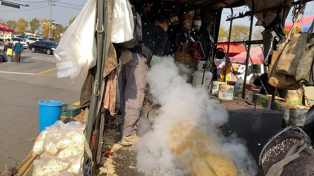 연기가 자욱해졌다. 대포같이 생긴 기계가 김 나는 튀밥을 쏟아냈다. 짧은 파마머리를 하신 아주머니가 나가서 튀밥이 든 봉지를 받아오셨다.