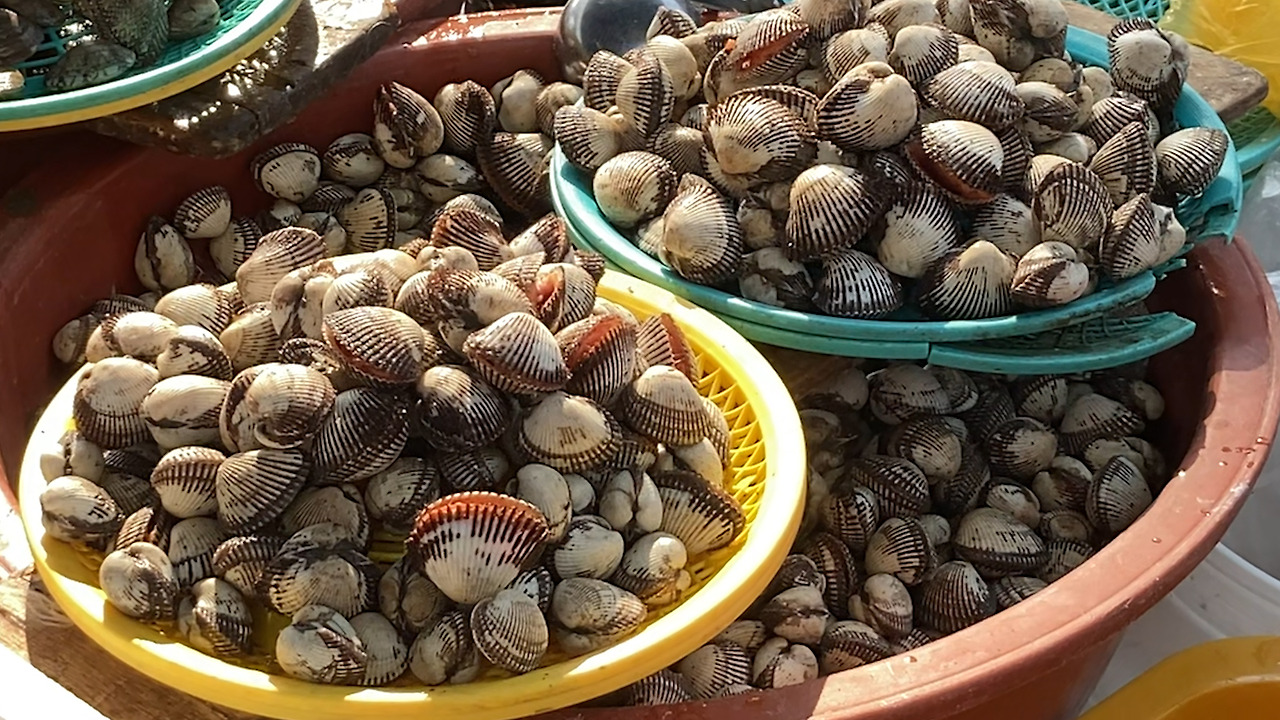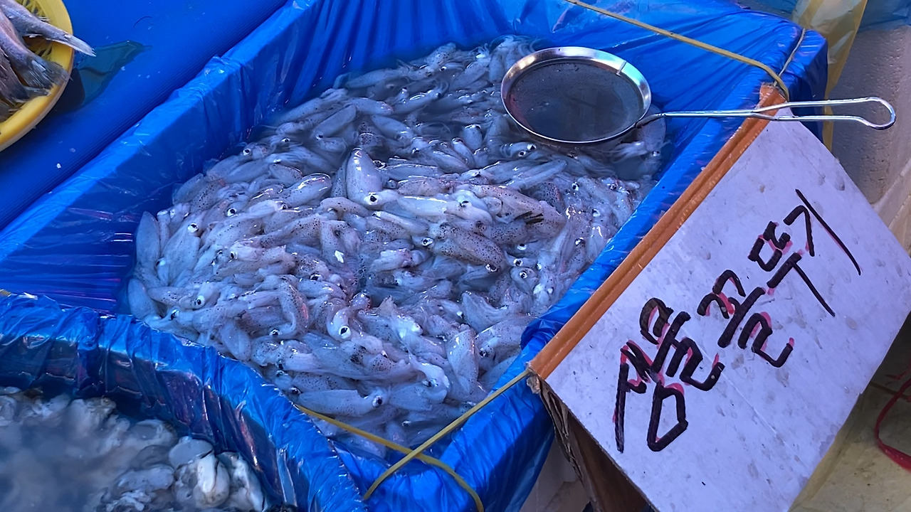 낙지가 대야에서 기어 나오고 있었다. 저렇게 기운이 좋으니 보양식이라고 하는 건가? 수산물 파는 곳에서는 싱싱한 낙지, 문어, 전복, 팔딱이는 꽃게를 팔고 있었다. 오징어, 명태, 갈치, 삼치, 가자미, 고등어, 꼬막, 굴. 바다에서 잡히는 것 중 없는 걸 찾는 게 더 빠를 것 같았다. 종아리만큼 굵은 은갈치는 옆집 가족까지 함께 먹어도 될 만큼 큼직했다.