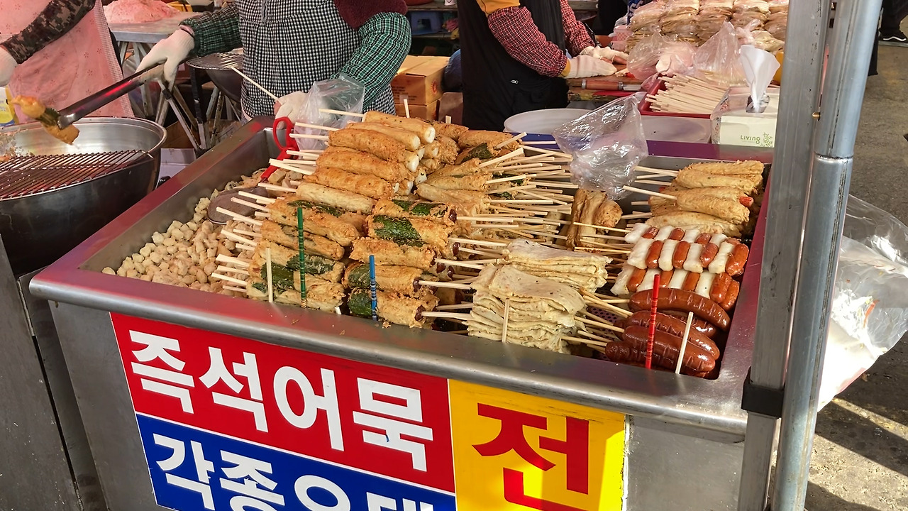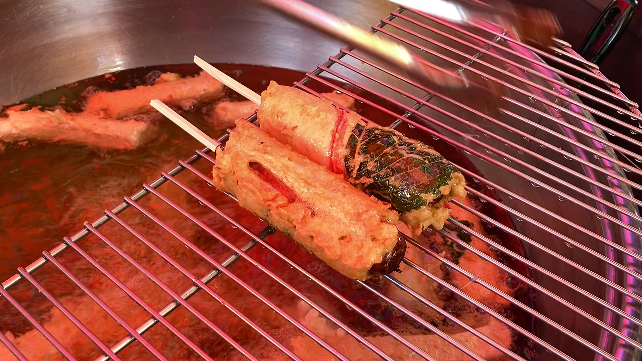 고소한 냄새가 났다. 즉석에서 수제 어묵을 튀기고 있었다. 깻잎 위에 다진 생선과 채소를 넣은 반죽을 올려 돌돌돌 말고 기름에 퐁당. 어묵이 기름 안에서 바글바글 끓는 소리와 맛있는 냄새가 사람들의 발길을 붙든다. 두툼하고, 탱탱하고, 기름이 반지르르 도는 탐스러운 비주얼. 김 폴폴~ 나는 뜨끈뜨끈한 어묵을 나무젓가락 쿡 찍어서 건네주셨다. ‘오~ 뜨거워 뜨거워’ 하면서도 입을 멈출 수 없는 맛이었다.