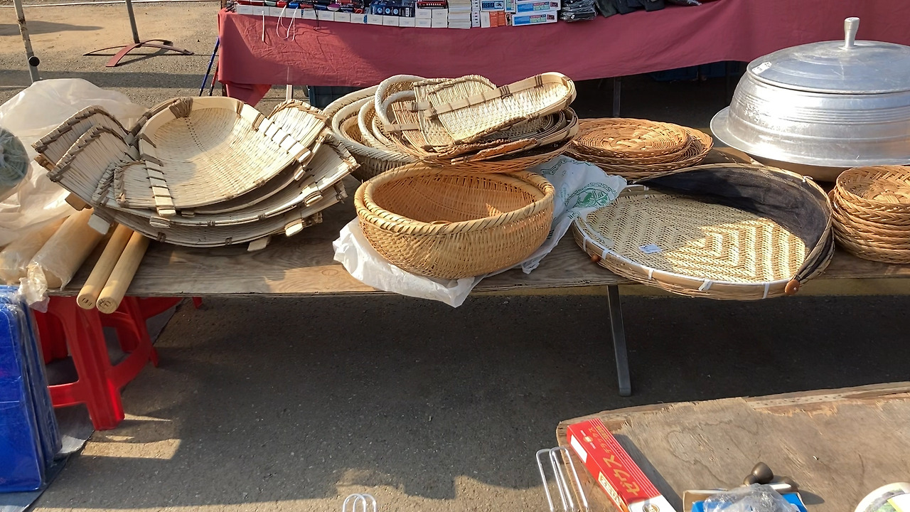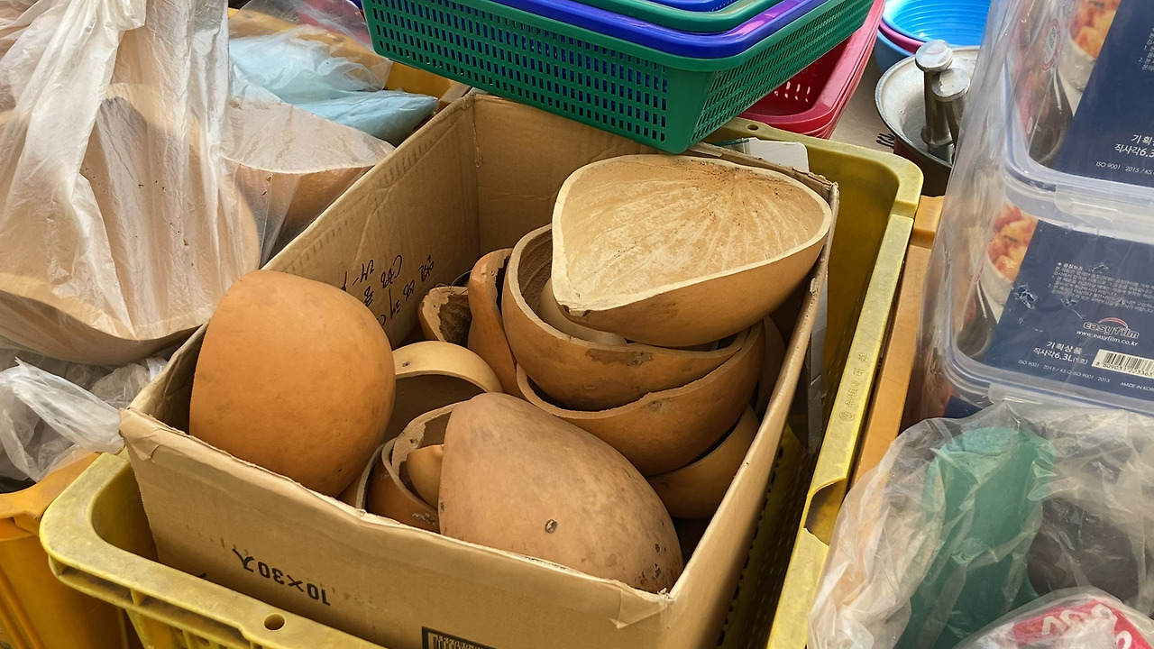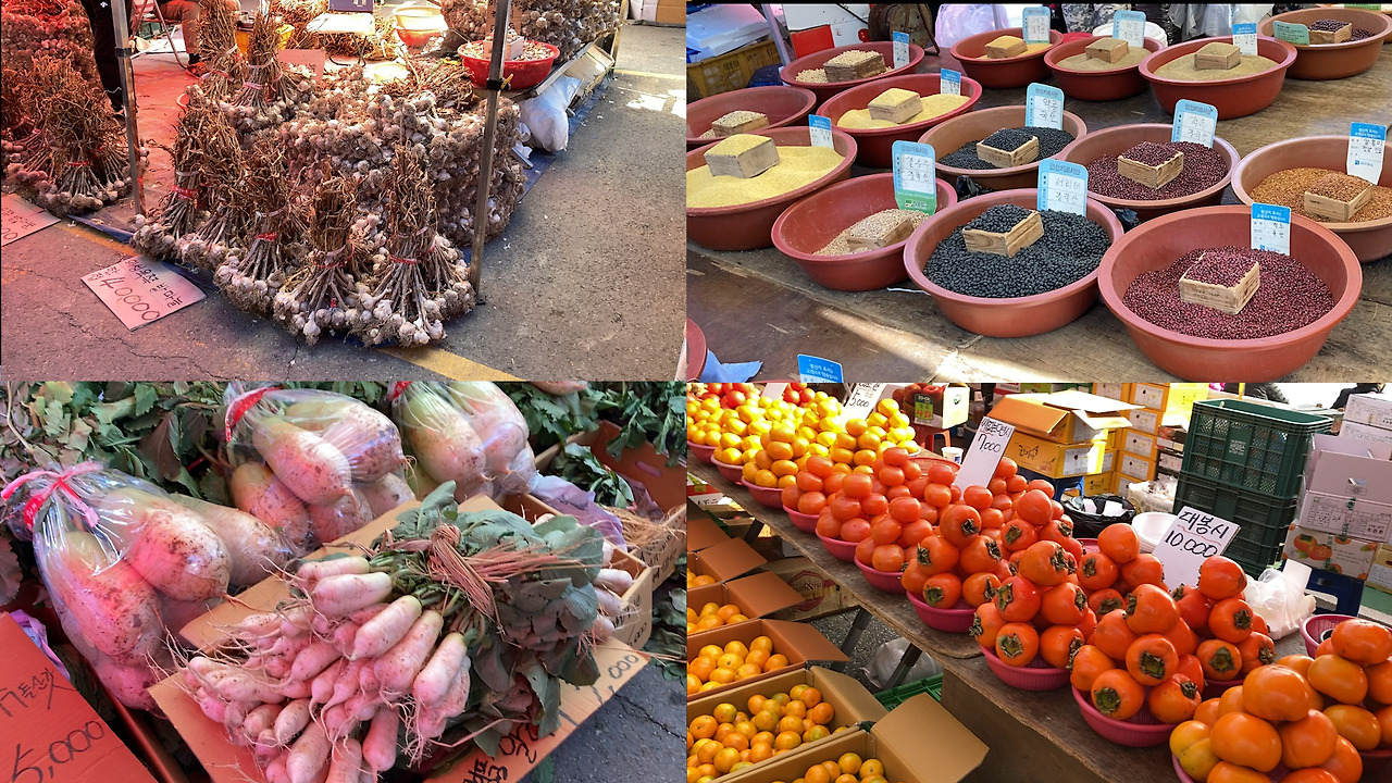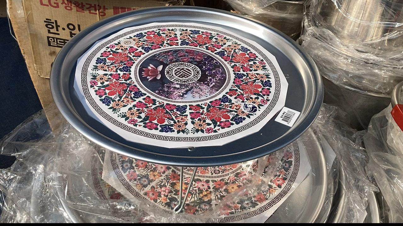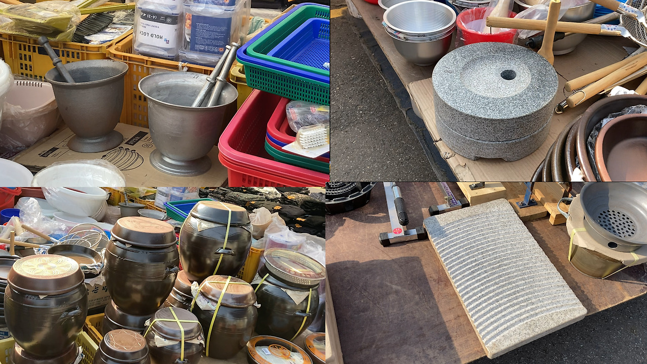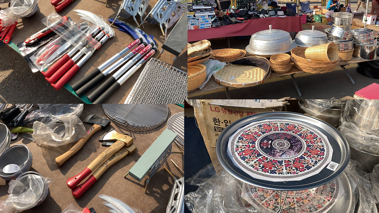 장터엔 없는 거 빼곤 다 있었다. 과일, 채소, 족발, 떡볶이, 튀김, 치킨. 직접 만든 두부, 청국장, 묵. 가마솥도 있고 시골 생활의 필수품. 삽, 호미, 빗자루도 팔았다. 쇼핑 리스트엔 없지만 시골 정취가 제대로 느껴지는 밥상과 쟁반도 샀다. 은색 바탕에 꽃이 그려진 알루미늄 소재였다.