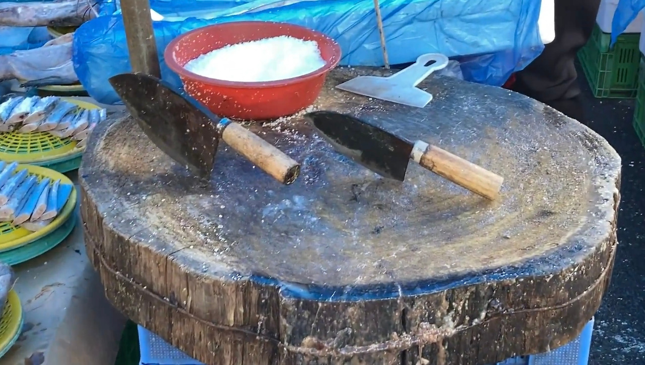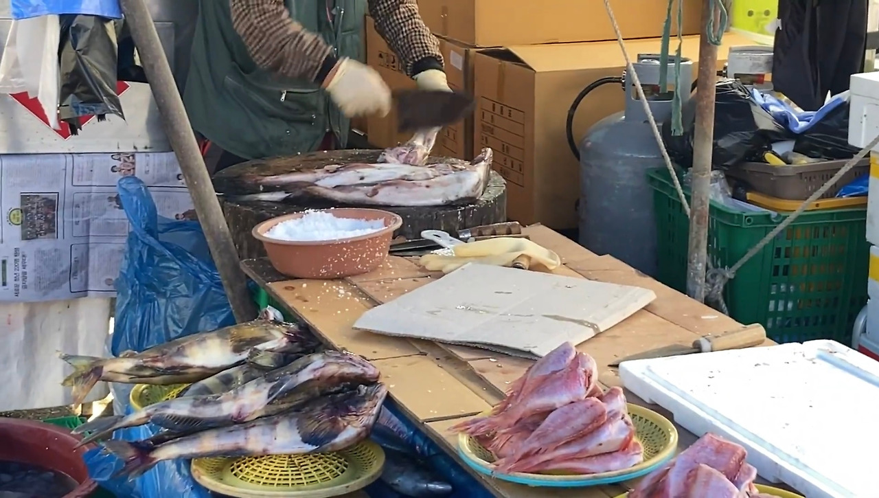 동태를 파는 사장님은 카리스마 있는 모습으로 생선을 손질해주셨다. 통나무 그루터기를 통째로 자른 나무 도마 위에서 칼로 검도하듯 절도 있게 생선을 내려치셨다. 그 모습이 얼마나 단호하고 노련한지 손이 닿기도 전에 동태가 잘려 나가는 것 같았다.