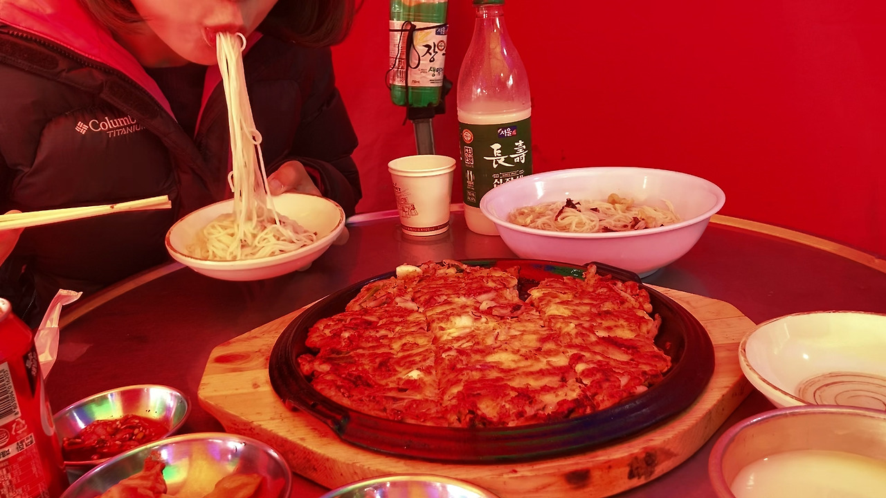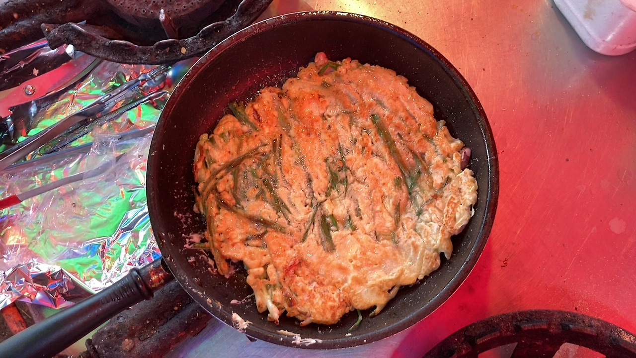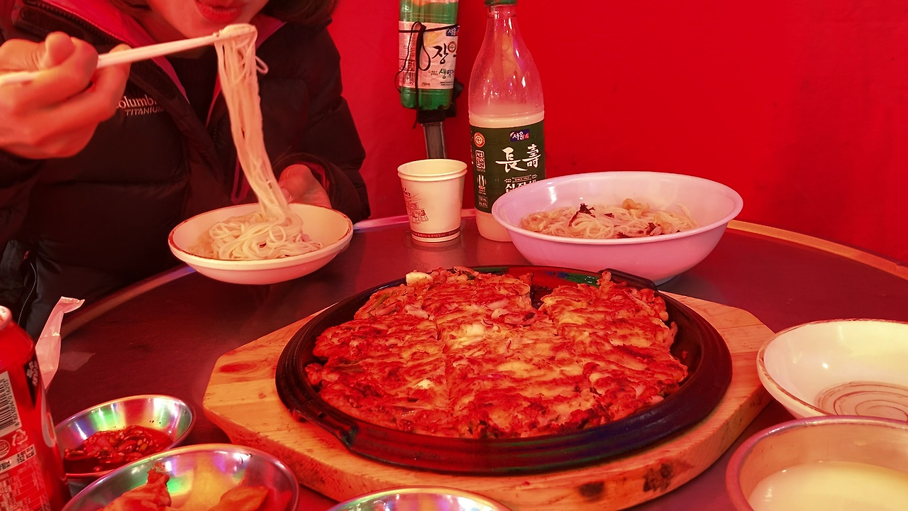 튀밥으로 시동을 걸었으니 메인 요리를 먹으러 갈 차례였다. 포장마차촌으로 갔다. 석쇠에서 노릇노릇 굽고 있는 전어, 양념을 맛깔스럽게 바른 등갈비, 바다 냄새 나는 삶은 소라가 ‘어서 오세요, 들어오세요.’ 손님을 부르고 있었다. 자리에 앉아 잔치국수, 해물파전, 막걸리를 시켰다. 사장님은 주문과 동시에 해물과 파를 아낌없이 넣고 달군 프라이팬 위에 지글지글 전을 구웠다.