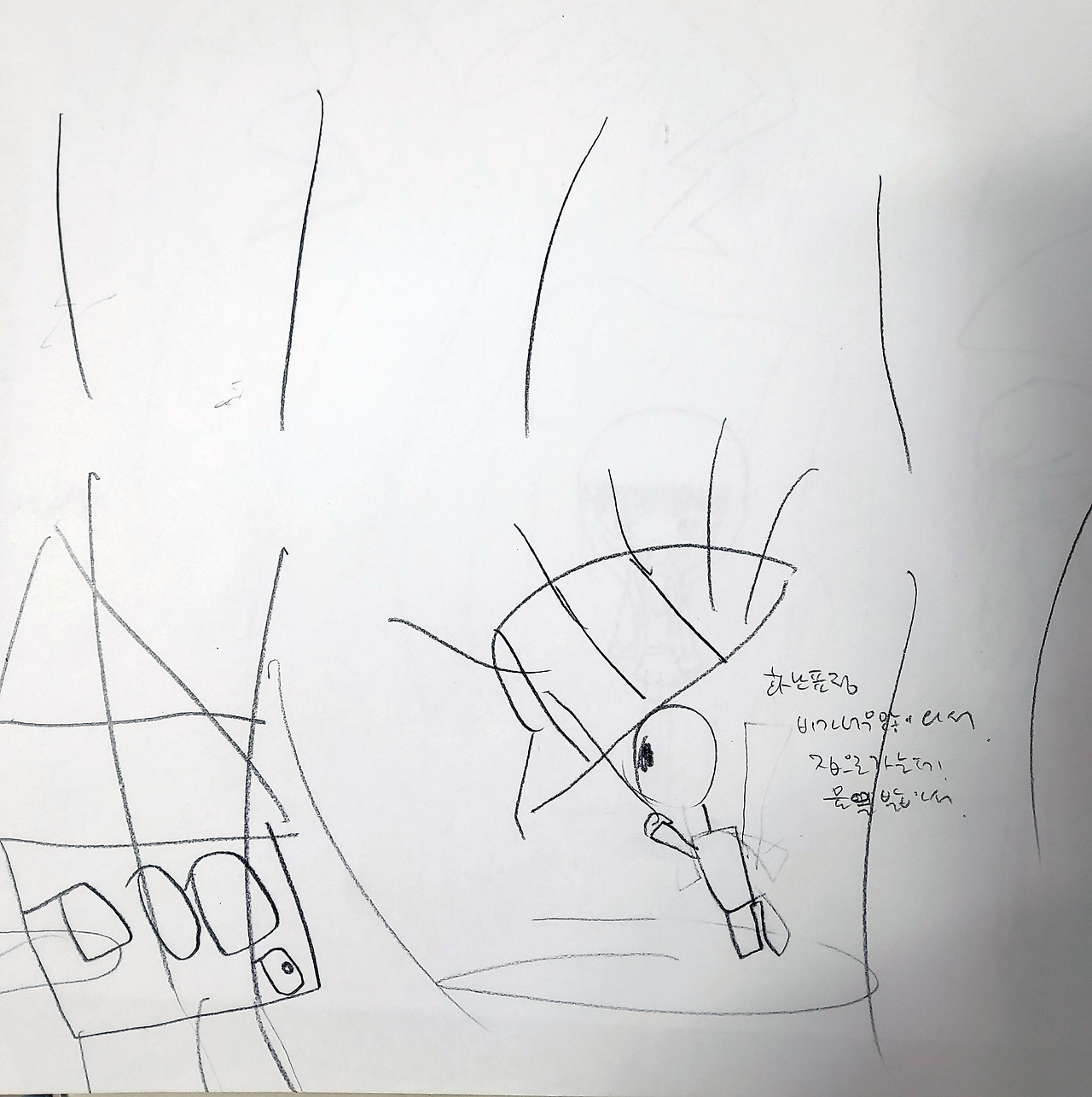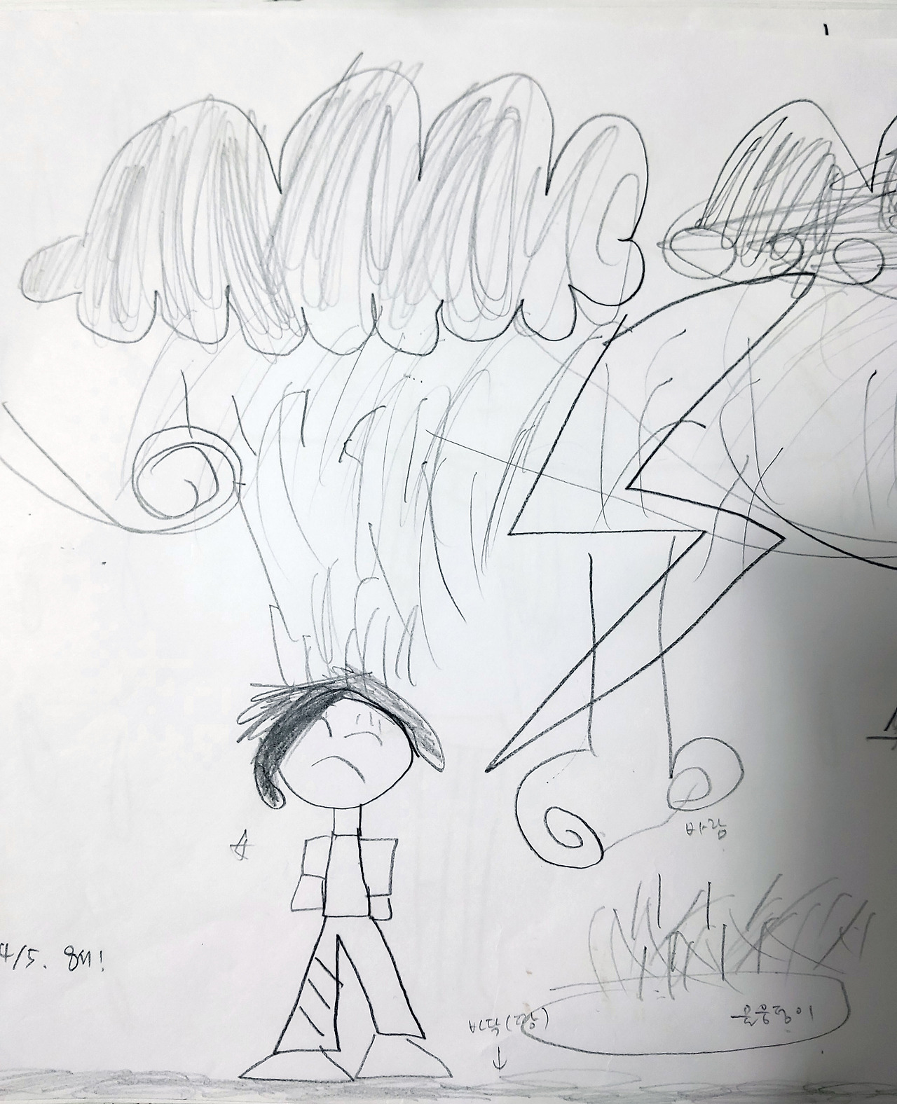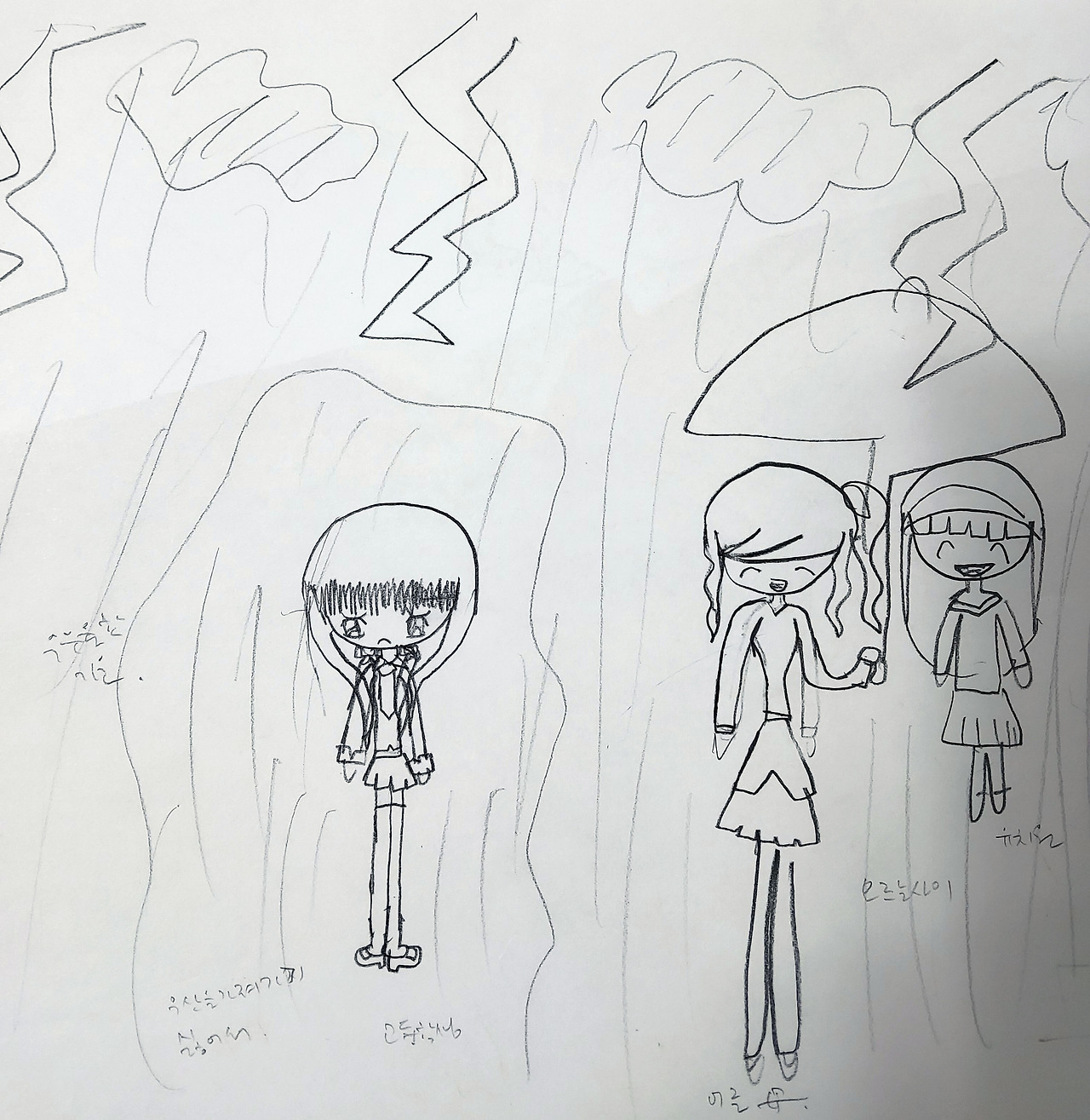 옛 노래에 '동그라미 그리려다 무심코 그린 얼굴'이란 노랫말이 들어가는 노래가 있다. 초등학교 3학년 때 담임 선생님이 좋아하시던 노래였는데 미술치료의 주제곡이라 불려도 무방할만하다. 위의 그림을 저작권 걱정 없이 그림 전체를 공개할 수 있는 건 실은 내가 그렸기 때문이다. 십오 년 전쯤에 눈물을 찍어내며 일기를 쓰다가 무의식적으로 그린 건데 내가 미술치료를 배울 당시에는 '빗속의 사람 그리기' 테스트 그림을 배우지 않았었다. 일기를 쓰다가 웬일로 그림 그릴 마음이 생겨서 무심히 옆 페이지 그렸는데 알고 보니 스트레스 진단 테스트를 해 버린 것이다. 이 사실을 알게 된 이후로 학원에서 아이들에게 ‘동적 가족화’와 ‘학교 생활화’ 외에 이 테스트를 추가해서 진행하게 되었다.