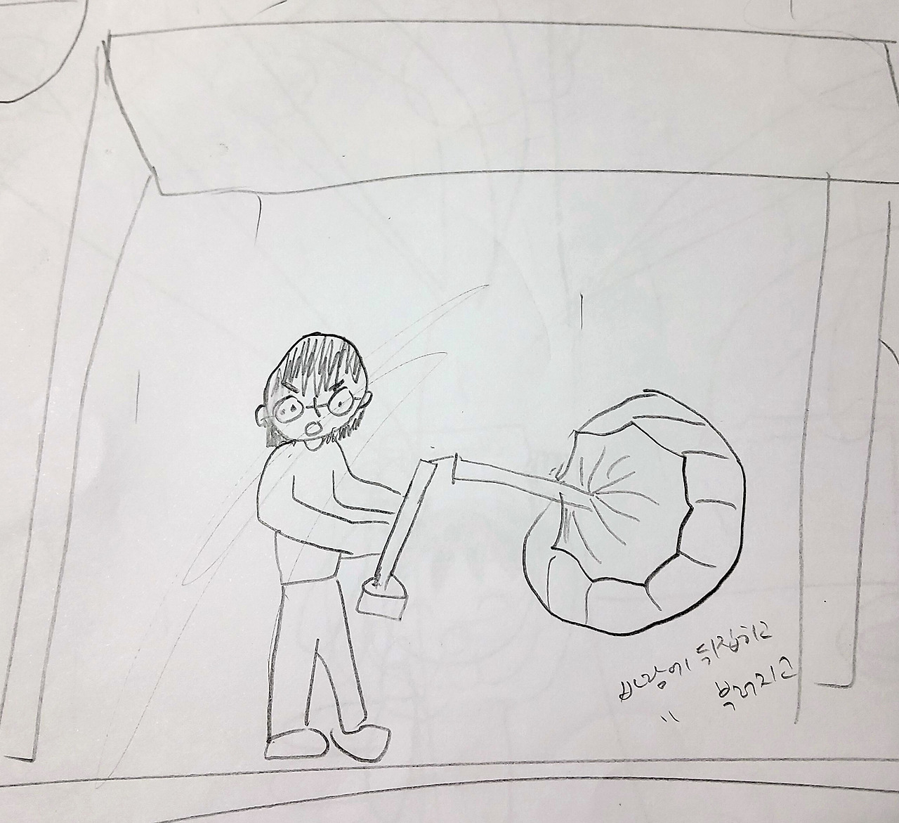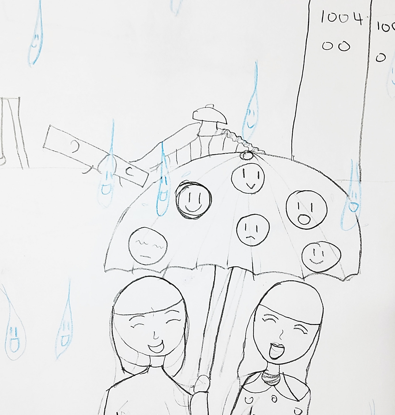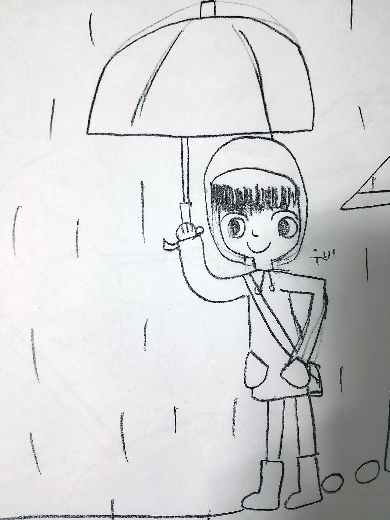 옛 노래에 '동그라미 그리려다 무심코 그린 얼굴'이란 노랫말이 들어가는 노래가 있다. 초등학교 3학년 때 담임 선생님이 좋아하시던 노래였는데 미술치료의 주제곡이라 불려도 무방할만하다. 위의 그림을 저작권 걱정 없이 그림 전체를 공개할 수 있는 건 실은 내가 그렸기 때문이다. 십오 년 전쯤에 눈물을 찍어내며 일기를 쓰다가 무의식적으로 그린 건데 내가 미술치료를 배울 당시에는 '빗속의 사람 그리기' 테스트 그림을 배우지 않았었다. 일기를 쓰다가 웬일로 그림 그릴 마음이 생겨서 무심히 옆 페이지 그렸는데 알고 보니 스트레스 진단 테스트를 해 버린 것이다. 이 사실을 알게 된 이후로 학원에서 아이들에게 ‘동적 가족화’와 ‘학교 생활화’ 외에 이 테스트를 추가해서 진행하게 되었다.