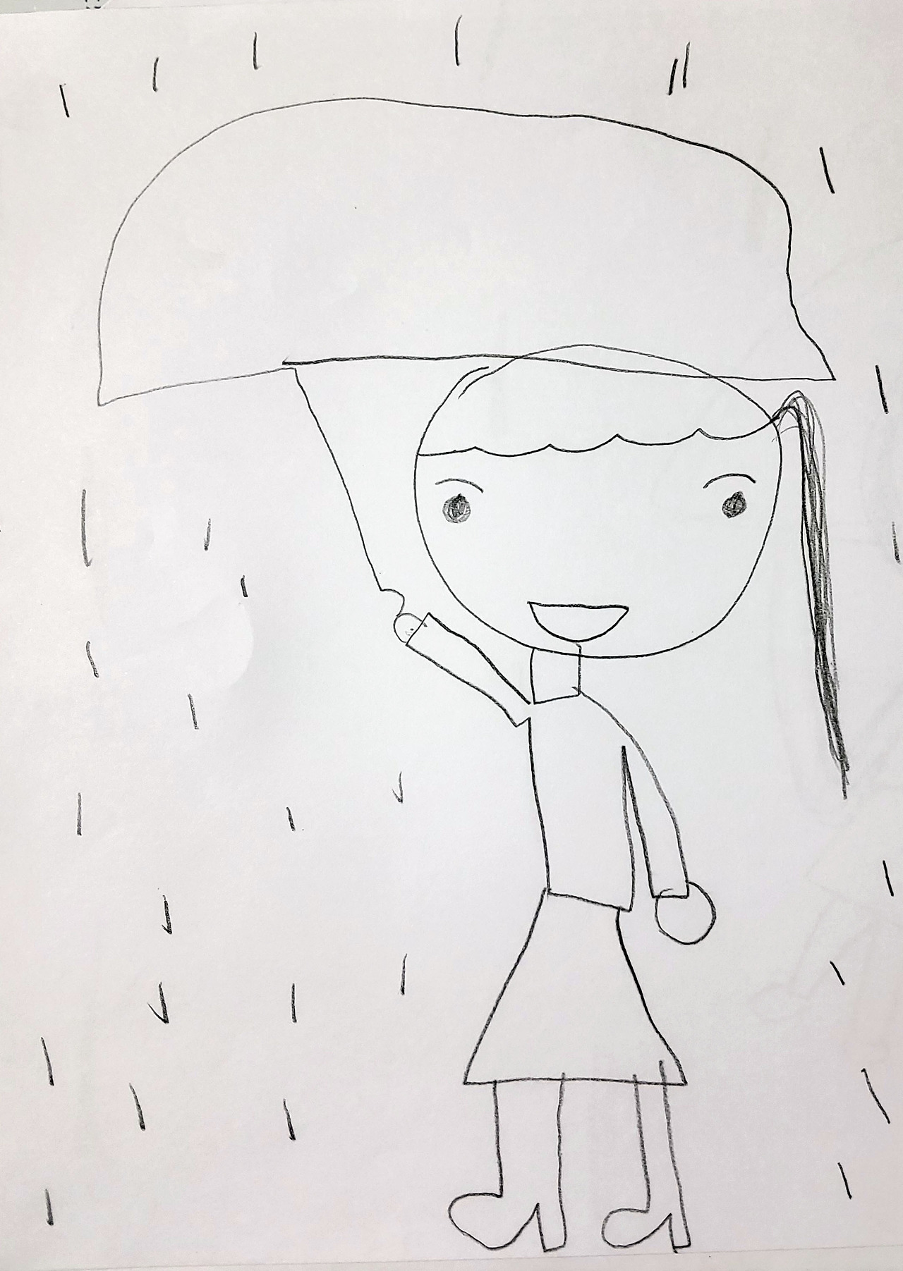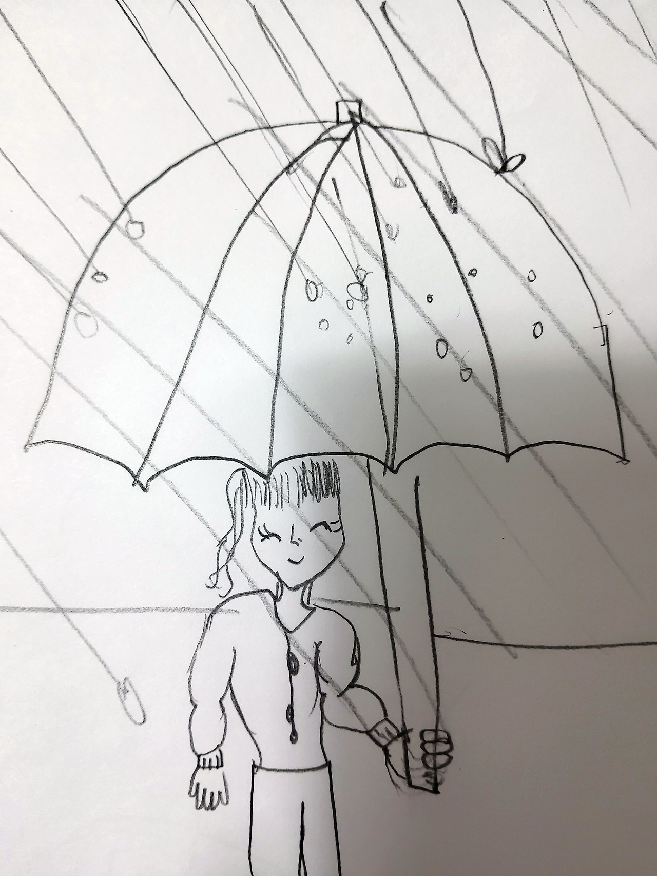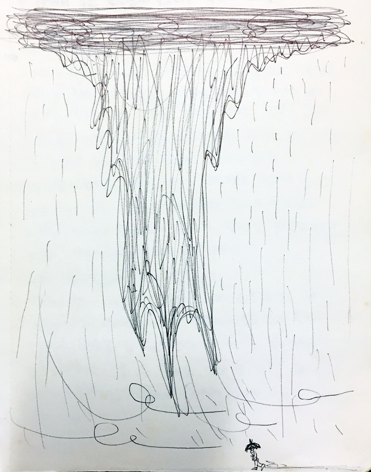 마침 이 딱하고 불쌍해진 그녀가 당시에 그린 스트레스 진단 테스트 그림이 내 수중에 있다. 하늘에 구멍이 뚫린 정도가 어마어마하다. 그 큰 구멍에서 엄청난 양의 비, 비라고 할 수 없을 만큼의 물 폭탄이 쏟아지고 있고 바람까지 분다. 인물의 크기는 알아볼 수 없을 만큼 작다. 인물의 크기는 자아의 크기로 해석한다. 얼굴 표정도 읽을 수 없다. 무자비해 보이는 물 폭탄은 곧 인물 위로 콰르릉 쿵쾅 쏟아지게 생겼고 삼지창처럼 찌를 듯이 거칠고 공격적으로 보인다. 사람은 곧 물살에 떠밀려 갈 판인데 머리 위 상황과는 상관없이 급하게 걸을 일도 없어 보인다. 지면에 껌딱지처럼 작게 붙어 있는 사람은 우산을 쓰고 있기는 하나 어디 저 거대한, 지면의 상당 부분을 차지하는 스트레스를 감당할 수나 있을까?