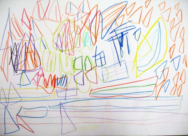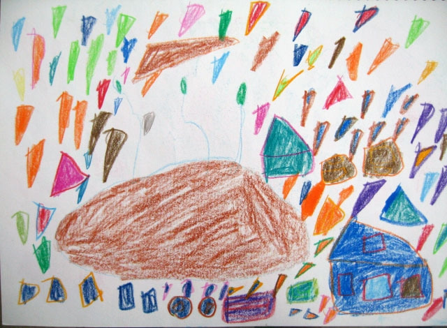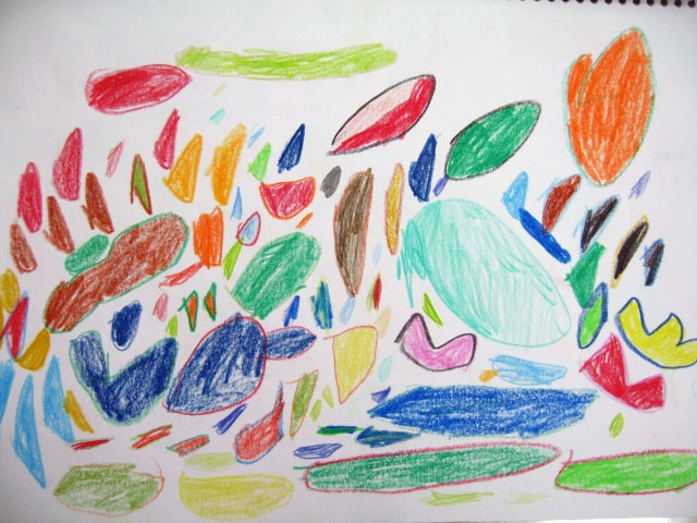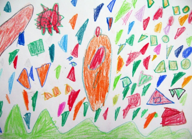 그 당시 현지가 그렸던 그림들은 사진으로 남아 있지 않다. 아래 그림은 8세 남자아이의 그림으로 현지가 그렸던 그림들과 매우 비슷하다. 이 두 아이 그림은 이런 비슷한 형태 외에 색깔을 알록달록하게 썼다는 공통점이 있다. 경계선 지능에 근접한 상태로 보이는 아이들 그림의 공통점은 무엇을 그리든지 나이에 비해 표현이 단순하고 비슷한 형태가 반복되면서 나열하는 것이다. 내가 본 바로는 그랬다.