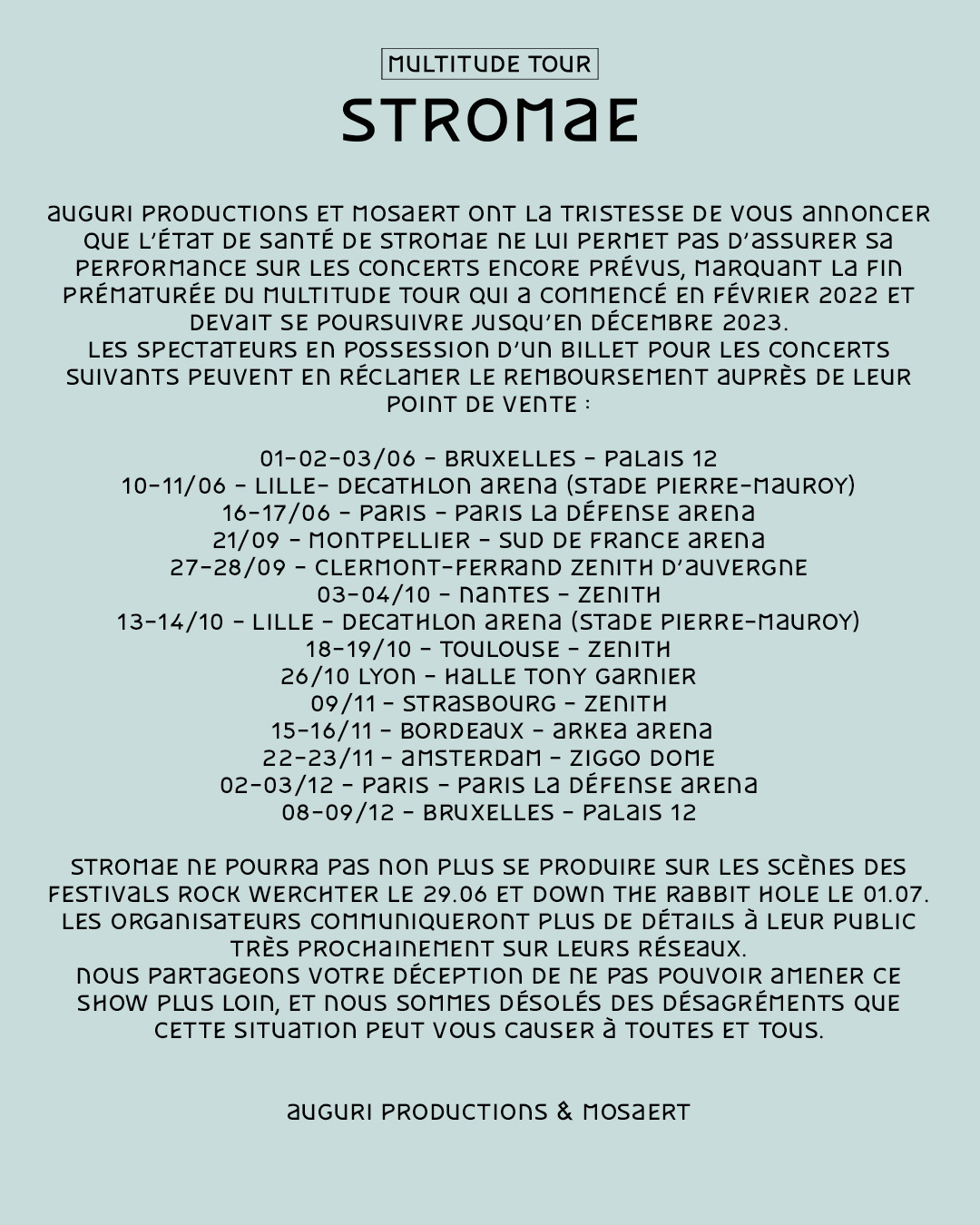 이렇게 굉장한 인기를 얻어 세계적으로 공연을 이어가던 Stromae는 아프리카 투어를 하기 위해 복용한 말라리아약의 부작용으로 결국 투어를 중단하게 된다. 이 약은 두통, 환각, 불안, 우울증, 자살 충동 등의 여러 부작용을 일으킬 수 있다고 한다. 그는 환각에 시달렸고, 수년동안 불안 발작으로 고통받았다고 한다. 이로 인해 그는 정해진 기약 없이 건강 회복을 위해 활동을 중단할 수밖에 없었다.