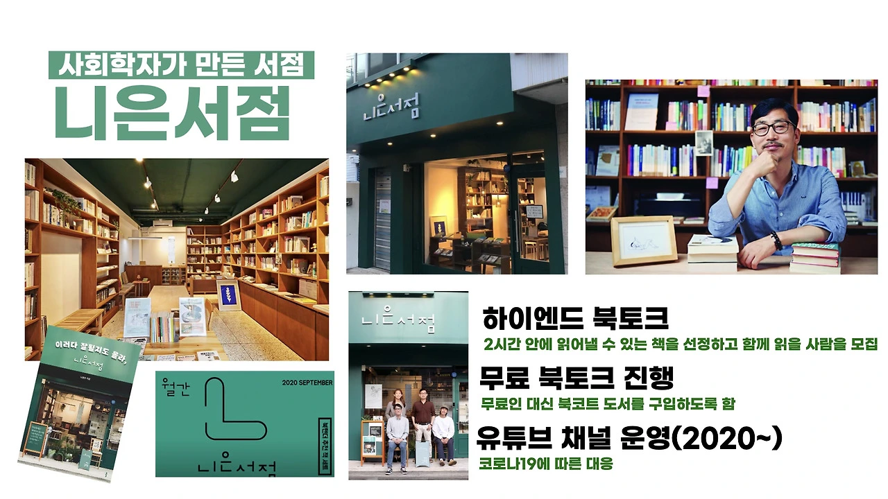 은평구 대조동에 위치한 니은서점은 더욱 확실한 컨셉을 지향한다. 사회학을 전공한 사장님이 사회학 서적으로 공간을 가득채운 것은 물론 북토크를 진행하며 사회학에 관심있는 독자들의 관심을 사로잡는다.