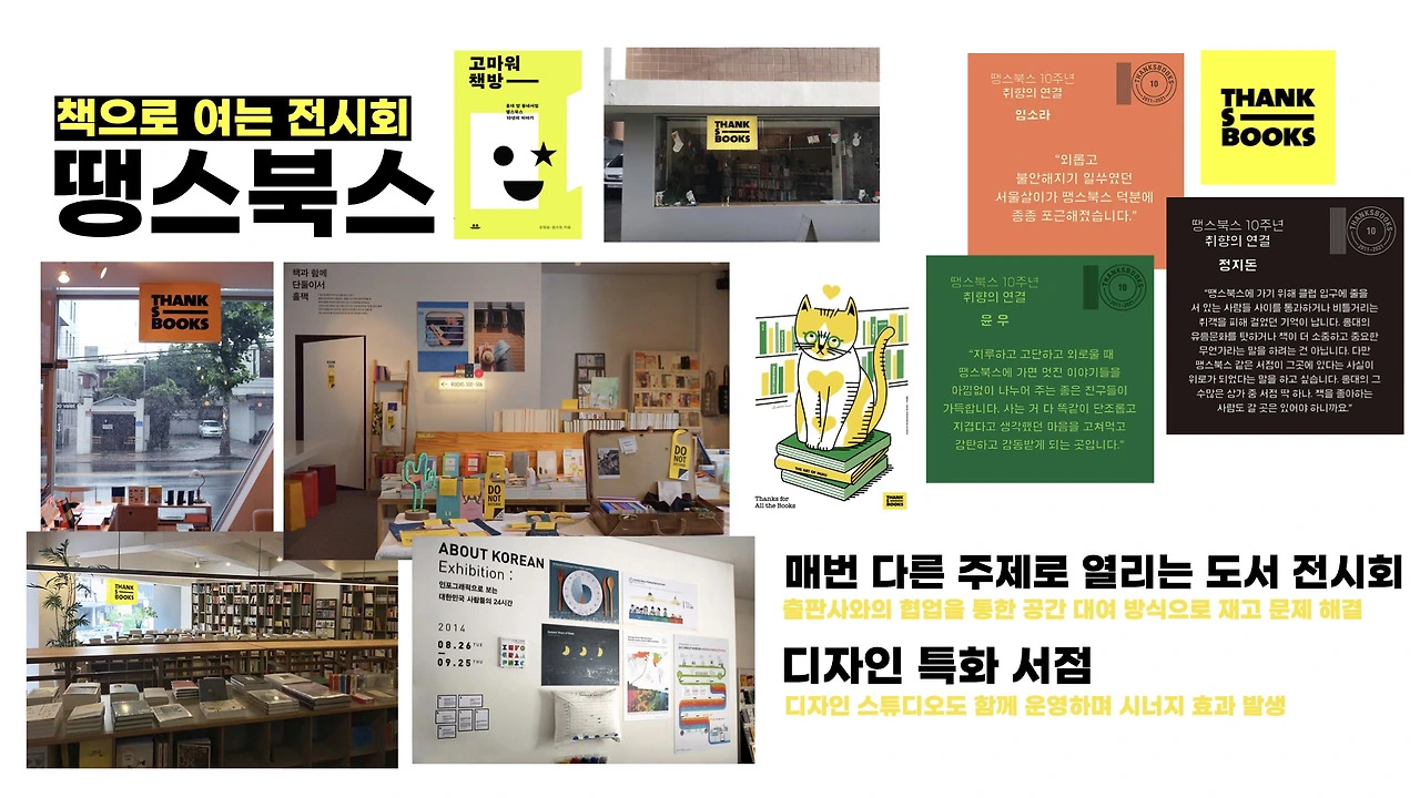 이러한 대형서점의 약점을 동네서점은 큐레이션으로 공략해냈다. 상수동에 위치한 땡스북스는 매번 주제를 정하고 책으로 전시회를 연다. 덕분에 작은 공간에 알맞은 딱 필요한 책들이 공간을 가득 채운다. 주제에 맞는 책이 전시되기 때문에 취향에 맞는 주제만 맞춘다면 모든 책이 관심가는 책이 될 수 있다. 서점자체가 하나의 주제인 곳도 있다.