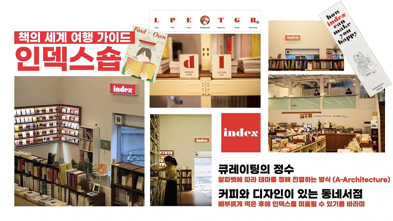 인덱스숍이라는 동네서점은 알파벳에 따라 테마를 정해 도서를 진열함에 따라 독자에게 큰 재미를 준다. 이를 테면 D 섹션은 알파벳 D로 시작하는 서적이 진열되는 것이 아니라 D(Design) 서적이 진열되어 있다. 따라서 자신의 관심사와 관련된 책이 자연스럽게 큐레이팅 되어 진열되는 방식이다. 여기저기 돌아다닐 것도 없이 그 섹션에 꽂혀있는 책들을 하나하나 둘러보고 훑어보는 것만으로도 즐거움을 얻을 수 있고 매력적인 책이 나에게 더 쉽게 다가온다.