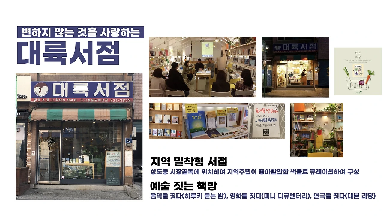 상도동 시장골목에 위치한 대륙서점은 이 동네사람들을 위한 아늑한 휴식처이다. 고객이 곧 동네 지역주민인 만큼 이들의 취향을 누구보다 잘알고 있는 서점주인이 이들의 취향에 맞는 책을 구비해놓기 때문이다. 복잡함 대신 안락함과 편안함은 대형서점이 가질 수 없는 동네서점만의 분명한 강점이다.