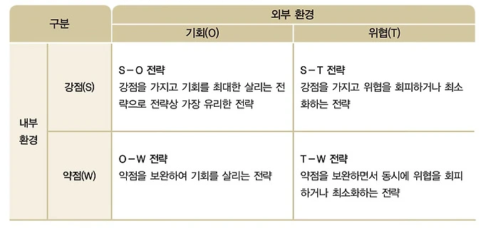 강점과 약점으로 기회와 위협 요인을 대비하는 전략을 도출하는 SWOT 분석