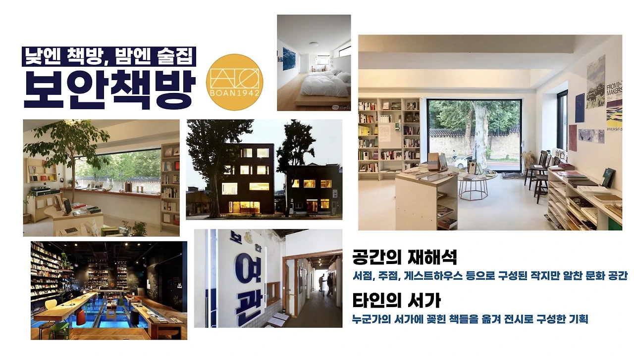 체험이나 문화공간의 역할이 강점인 동네서점도 있다. 효자동에 위치한 보안책방은 낮에는 책방 밤에는 술집으로 운영되는 새로운 시도를 보여주었다. 영화 보면서 맥주 한잔 마시는 것처럼 책을 마시면서 맥주한잔 하는 북맥의 문화를 지향하는 컨셉도 아주 새롭고 재밌다.