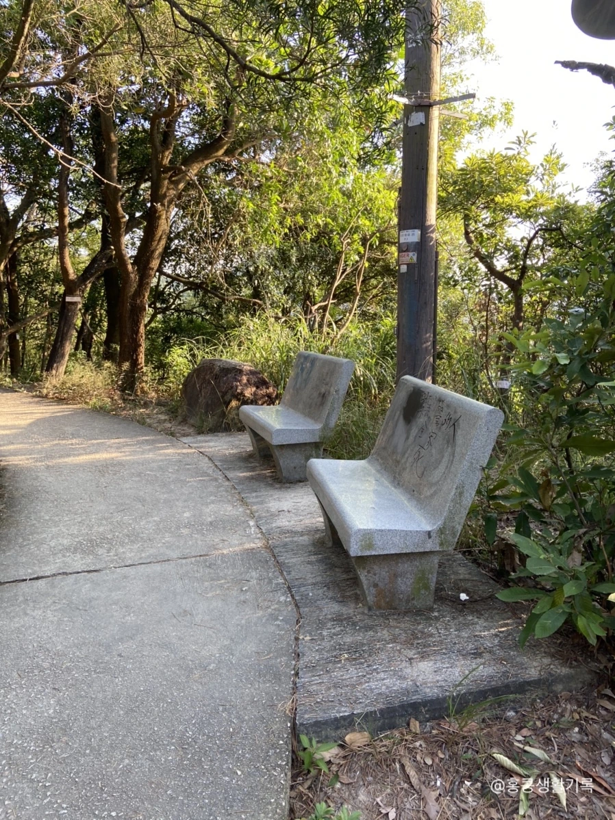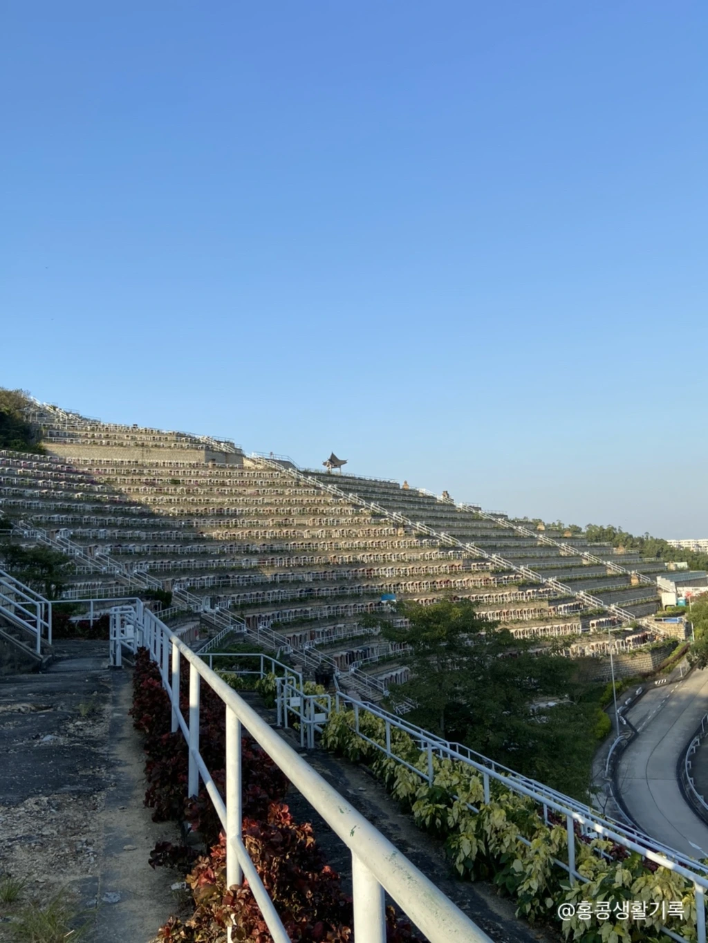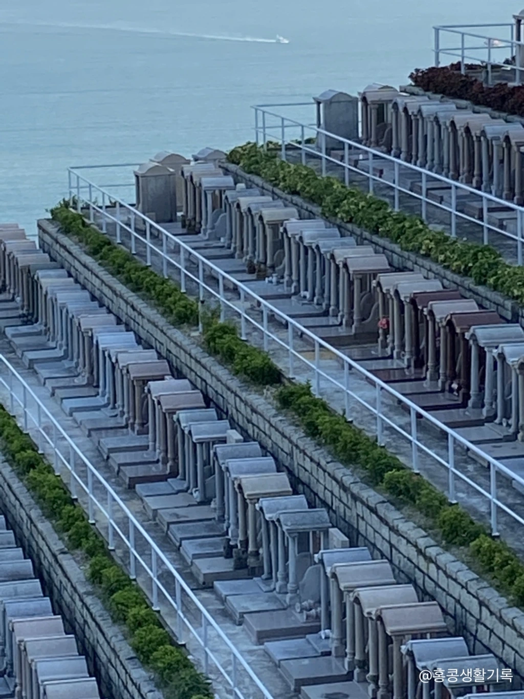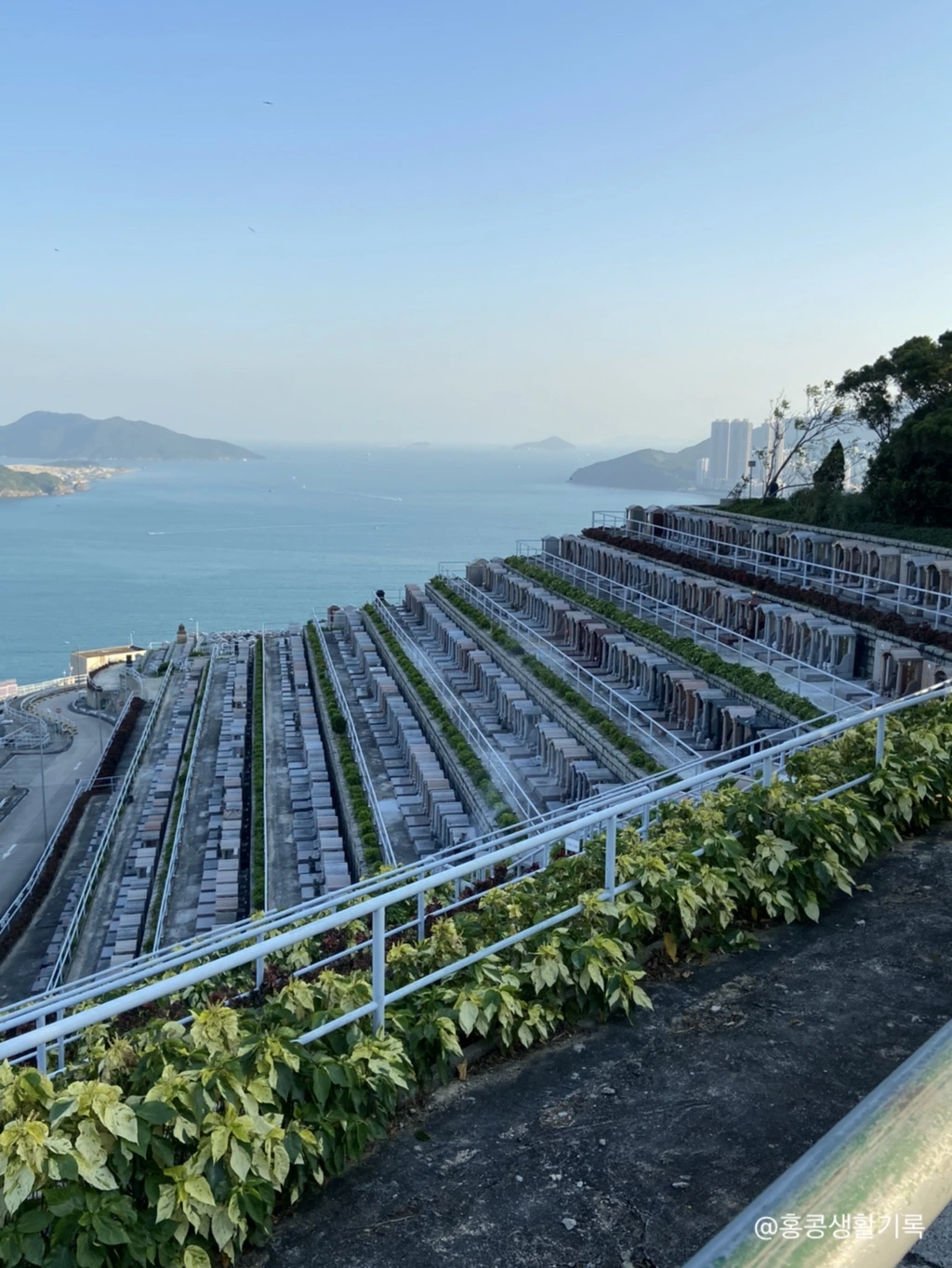 남쪽 바다로 탁 트인 전망대에 서서 양옆을 바라보자니 홍콩의 공원 묘원이 쫙 펼쳐져 있다. 언뜻 봤을 때는 계단식 농법인가 했을 정도로 빼곡하게 들어서 있는 비석.