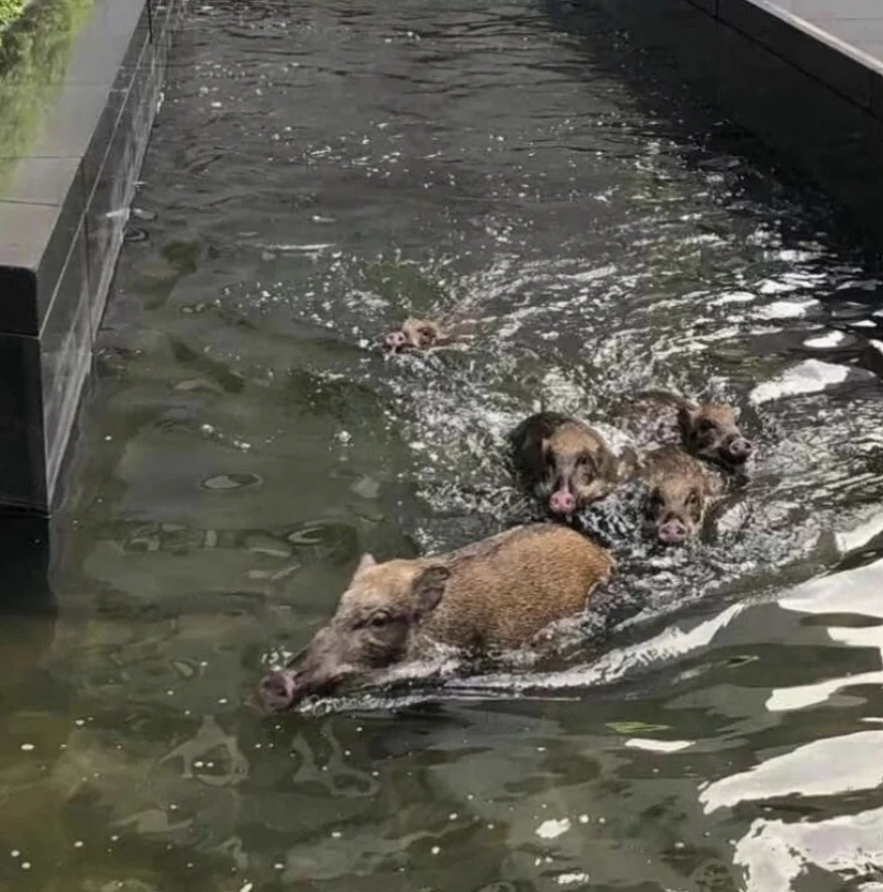 얼마 전 9월엔 뱅크 오브 차이나(Bank of China) 타워의 풀에도 나타나 화제가 되었던 멧돼지 가족. 멧돼지는 수영에 능하다고 한다.