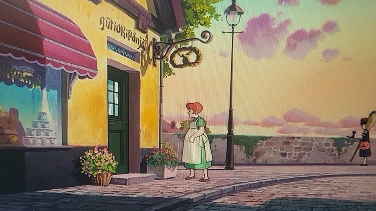 키키는 우연히 만난 빵집 주인의 호의로 가게와 연결된 집에 얹혀살게 됩니다. 가로등 하나가 우뚝 서있고 마을이 내려다 보이는 낮은 담으로 둘러싸인 빵집은 언덕 위에 자리 잡고 있습니다. 빨간 지붕아래 노란색 외벽에는 창문들이 나있고 커다란 꽃화분 사이로 초록색문이 있습니다.