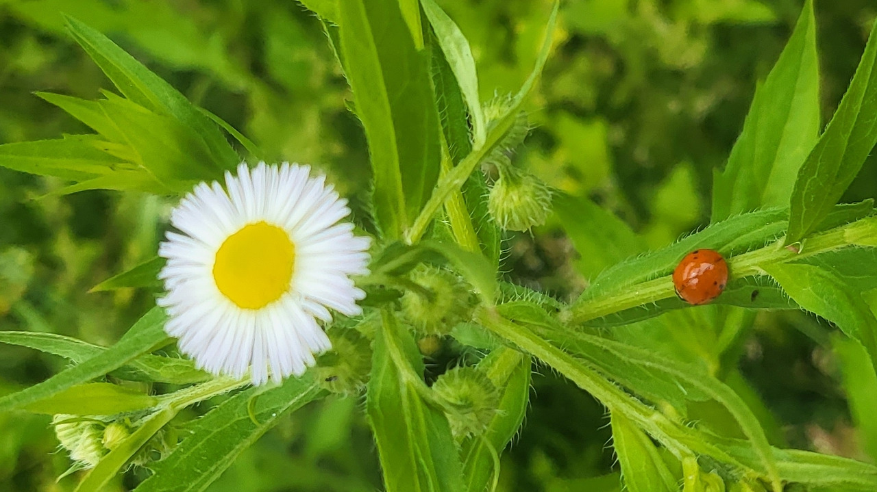 혼자 핀 개망초 한송이와 점박이 무당벌레 한 마리가 있습니다. 무당벌레가 마치 외로워 보이는 꽃에게 향하고 있는 것 같습니다. 그런데 자세히 보니 점박이가 이상한 것 같아요. 검색을 해보니 부모로부터 유전되기 때문에 모양이나 숫자가 다 다르다고 합니다. 그러고 또 생각해 보니까 너무 당연한 말이네요. 다를 수도 있는 건데 틀린 거라고 오해를 할 뻔했습니다.