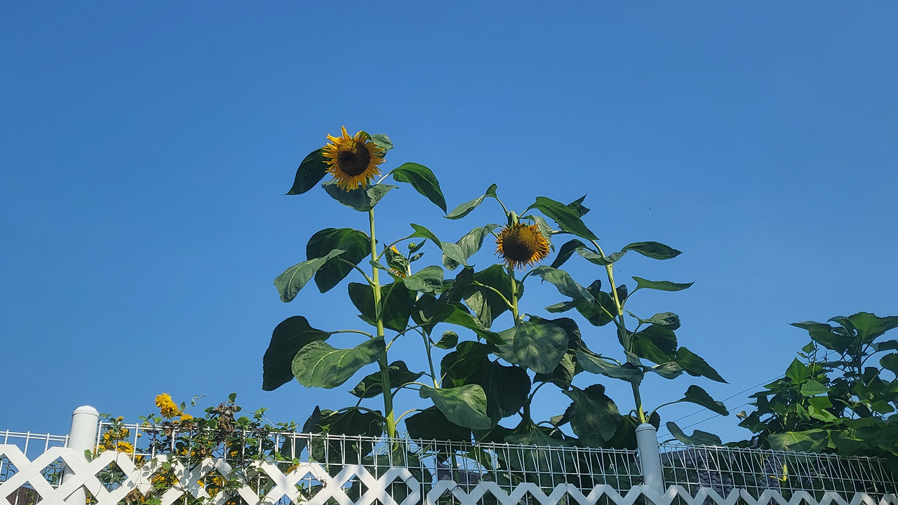 담장을 훌쩍 넘어 자라난 해바라기입니다.