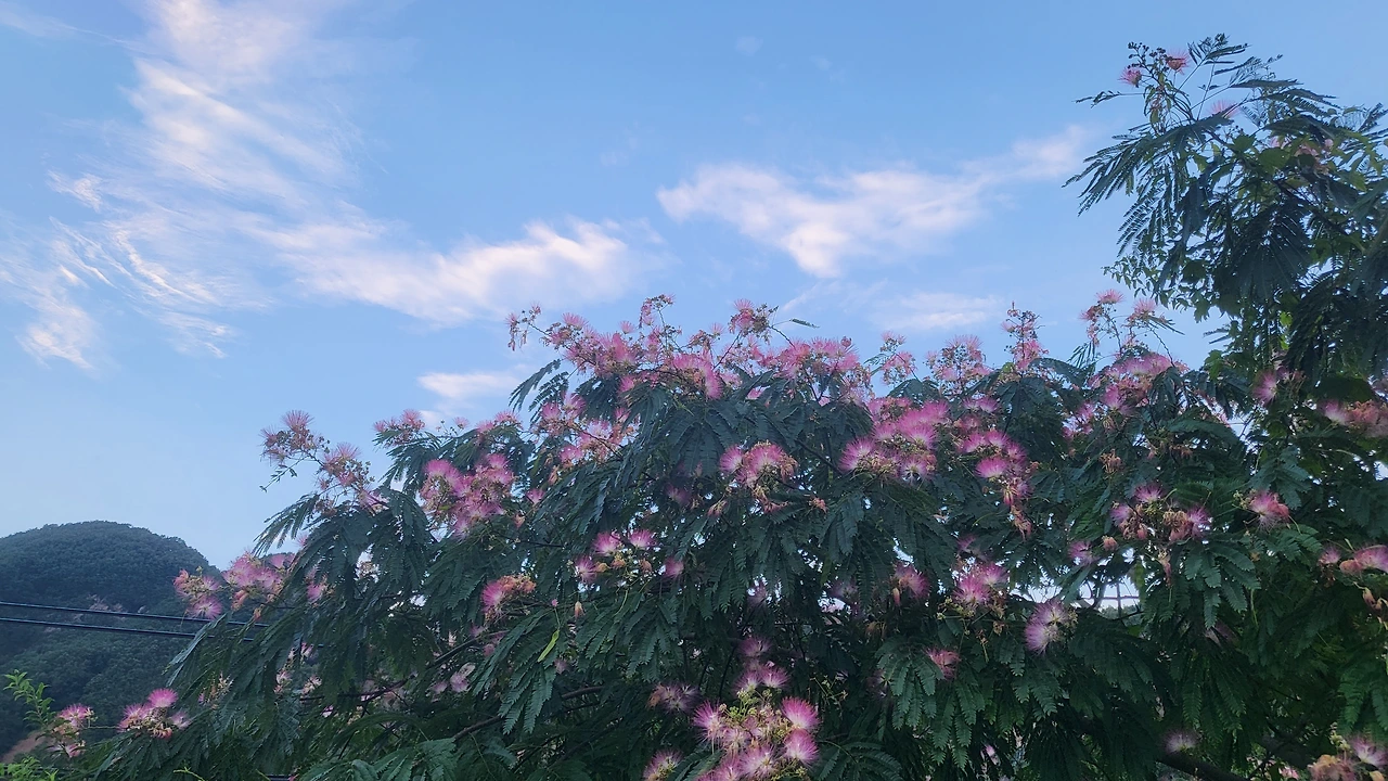 자귀나무입니다. 자귀나무 꽃은 가느다랗고 긴 수술들이 모여 부채 모양으로 보이는데요, 보송보송해 보여서 절로 손을 뻗게 만듭니다. 실제는 생각처럼 보드랍지는 않지만 보고 있으면 왠지 마음이 보송보송해지는 기분이 듭니다.