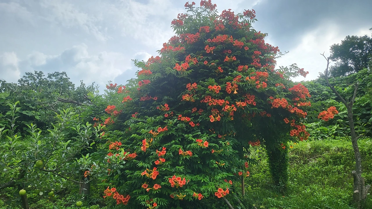 화사하게 핀 능소화와 달리 흐릿한 하늘이 대조가 되는 날이었습니다. 장마가 길고 비가 많았던 탓에 제대로 꽃구경을 못했습니다. 꽃들도 파란 하늘 아래에서 화려한 자태를 뽐내고 싶었을 텐데요. 그래도 꽃은 내년에도 또 찾아오겠지요.