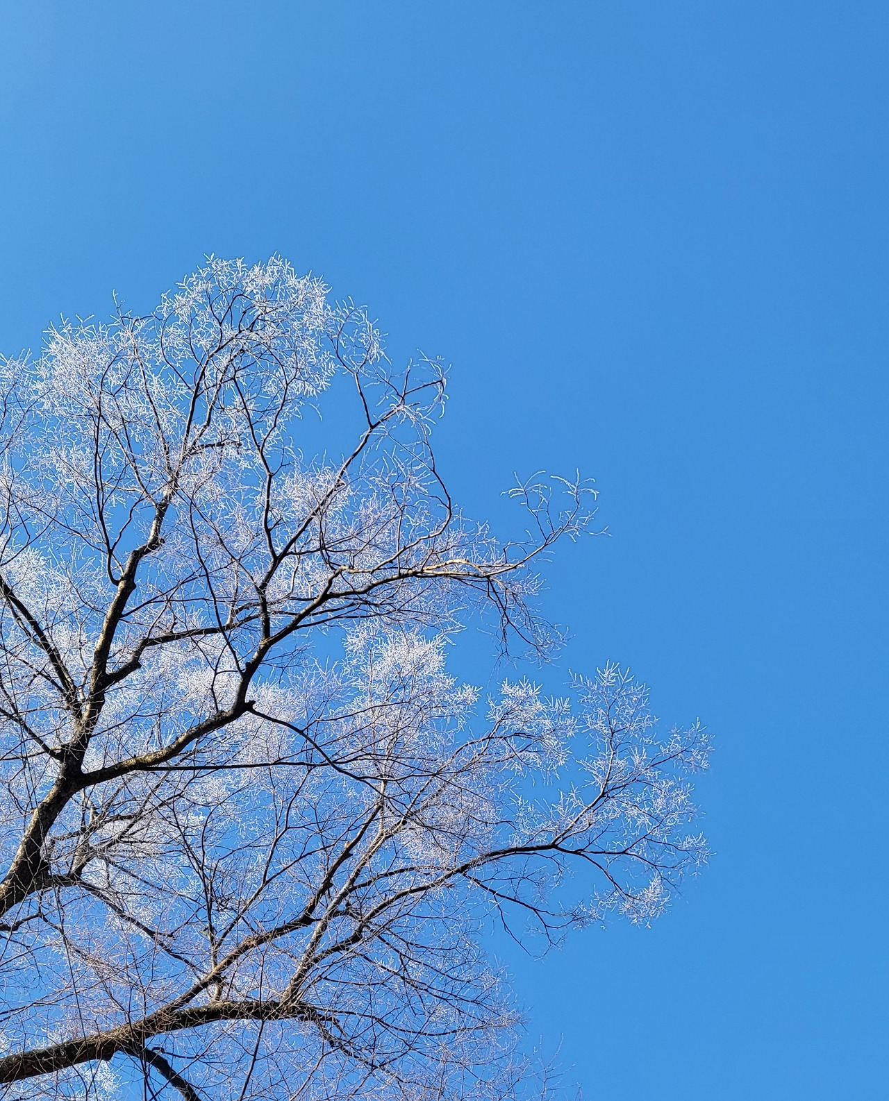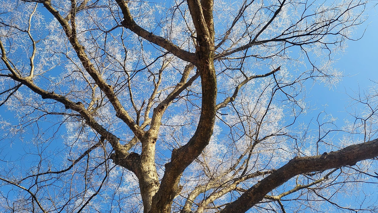 구름 한 점도 없는 파란 하늘 아래 나뭇가지는 하얗게 새로 태어났습니다. 원래가 하얀색인 듯 꽃처럼 보였고, 햇살이 들자 나무는 황금색으로 빛이 났습니다. 처음 보는 모습에 한참 시선을 빼앗겼습니다. 이전에도 보였던 풍경을 제가 놓쳤던 거겠죠.