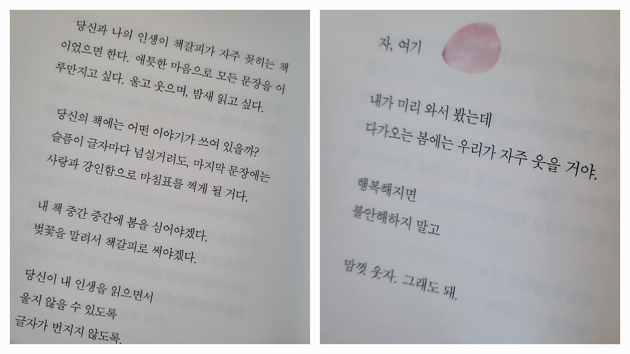 구경만 하려고 간 서점에서 충동적으로 책을 한 권 샀다. 성은 모르지만 나와 이름이 같은 작가님의 책이었다.흔하지 않은 이름 두 글자를 발견했을 때 신기하면서도 이상한 기분이 들어 홀린 듯 책을 집어 들었다. 나와 이름이 같다는 이유 하나로 내용은 제대로 확인도 하지 않고 계산대로 향했다.