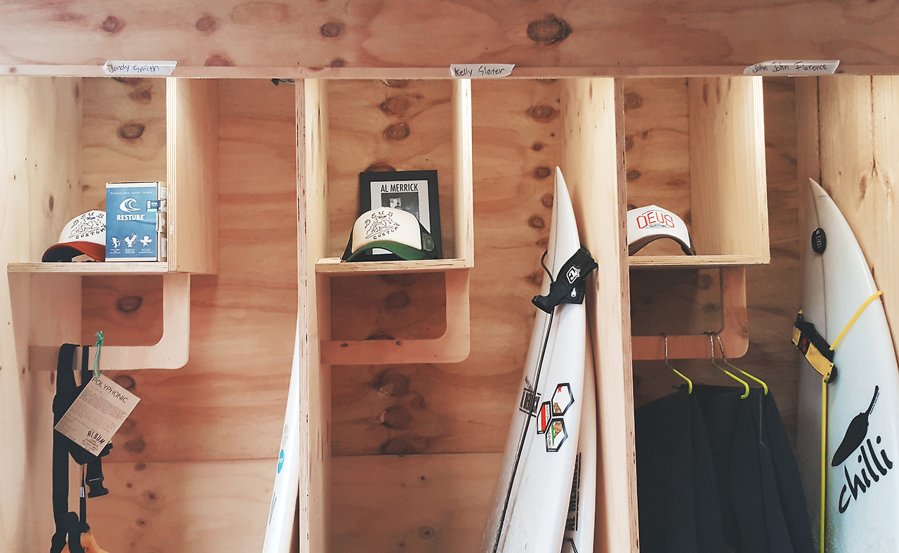 서핑 숍은 감각 있는 물건들로 가득했습니다. 서프보드와 모자들이 잘 정돈되어 있고 음악 연주와 비디오 게임을 할 수 있는 작은 소파도 있습니다. 눈길을 끈 것은 가게 한 편에 세워둔 나무로 만든 옷장이었습니다. 옷장에는 서핑에 필요한 물품들이 한 세트씩 들어 있었습니다.