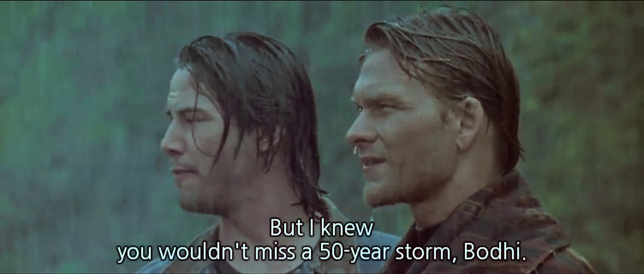 <폭풍 속으로>는 서프 문화를 다각도로 보여주는 영화입니다. 부족 문화, 지역에 대한 애착, 개인의 성취를 우선하는 정신적 측면, 현재를 즐기는 삶의 방식, 세상을 떠돌아다니는 삶 같은 것들이 잘 버무려져 나오는 것이 서프 문화입니다. 그래서 복잡한 삶에 매여 사는 우리의 관심을 끄는 매력이 서퍼들에게 있습니다. 비록 자신이 쫓는 범죄자이지만, 자유로운 서퍼들에게 마음이 끌리는 특수요원처럼 말이죠. 서퍼의 매력은 추종자들을 끌어모으는 힘이 있습니다. 지역 문화를 만들고, 동네를 형성하고, 커뮤니티를 만듭니다. 서핑의 힘입니다.