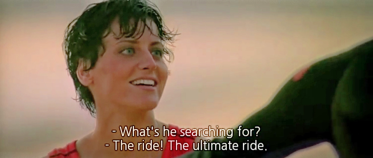 키아누 리브스가 해변에서 만난 여성 서퍼는 서핑 패거리의 우두머리인 패트릭 스웨이지를 소개하면서, 그를 '진정한 탐구자'라고 부릅니다.