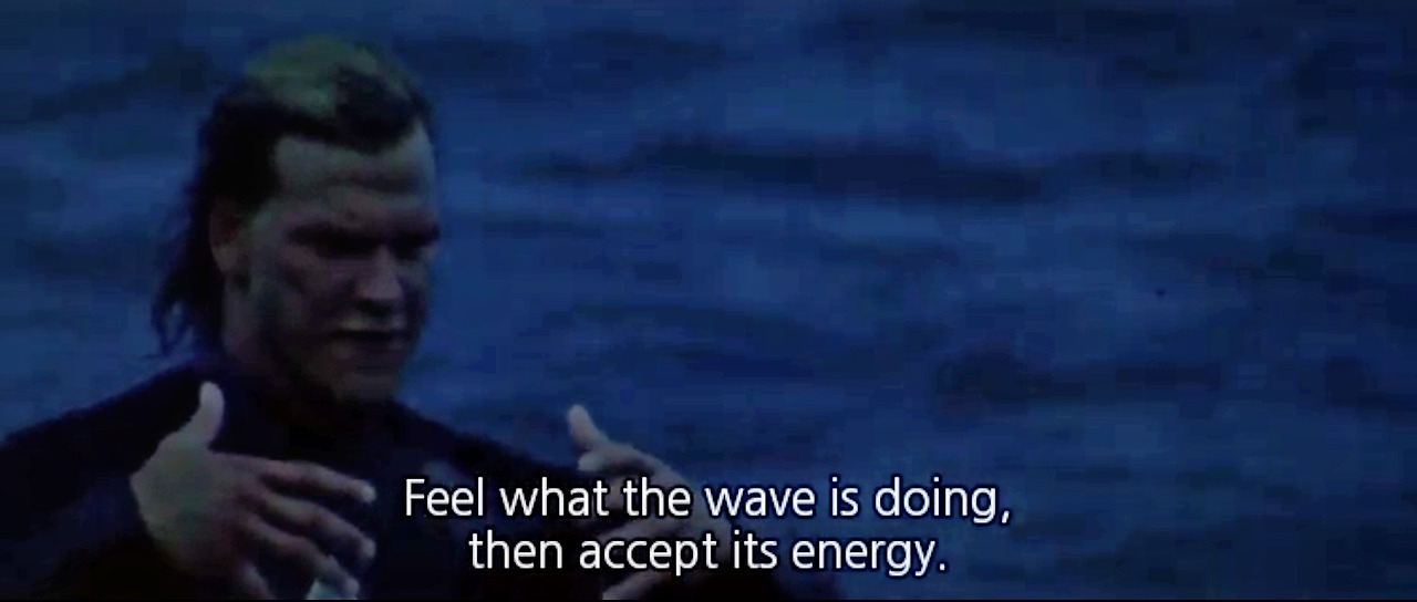 "파도가 하려는 바를 느끼고, 그 힘을 받아들여야 돼. 파도를 쳐다볼 필요도 없어. 시각은 과장된 것이 거든."