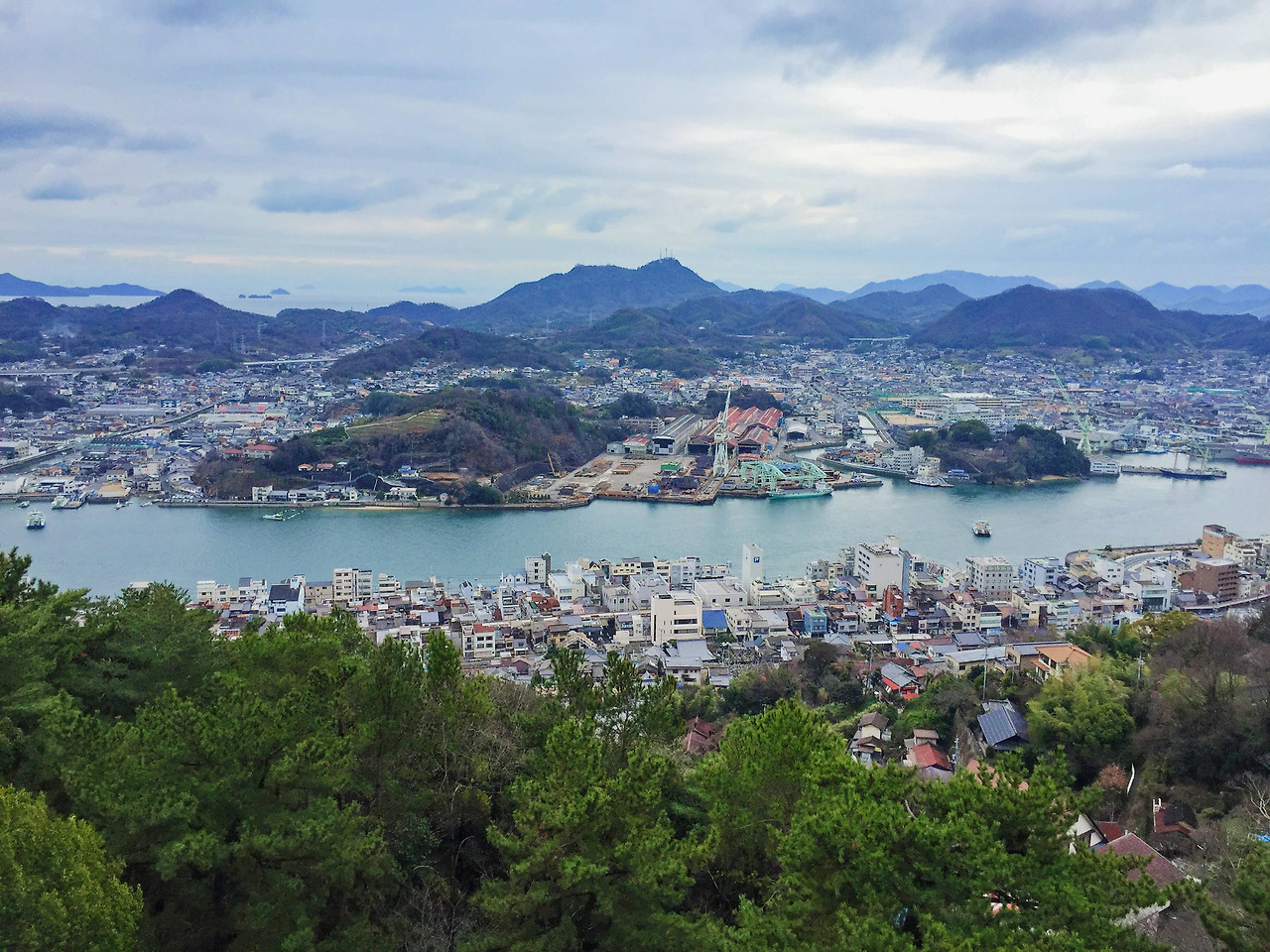 언덕 위에서 내려다보니, 오노미치의 독특한 지형을 파악할 수 있었습니다. 도시의 북쪽에는 언덕이 있고, 언덕이 내려오다가 급하게 바다를 만납니다. 언덕과 바다 사이의 좁은 평지에 다닥다닥 마을이 들어서 있고, 평지를 차지하지 못한 집들은 언덕을 따라 올라왔습니다. 언덕 위의 집으로 가기 위해 비탈길이 생기고, 비탈길을 연결하는 작은 돌계단이 놓이고, 계단을 둘 수 없는 급한 경사는 돌벽을 쌓아 막았습니다. 그리고, 돌계단과 돌벽의 틈에 고양이들이 숨어들기 시작했습니다. 이것이 지금 우리가 내려다보고 있는 오노미치의 경관입니다. 멀리 바닷가에 오노미치 U2의 콘크리트 지붕이 보이네요.