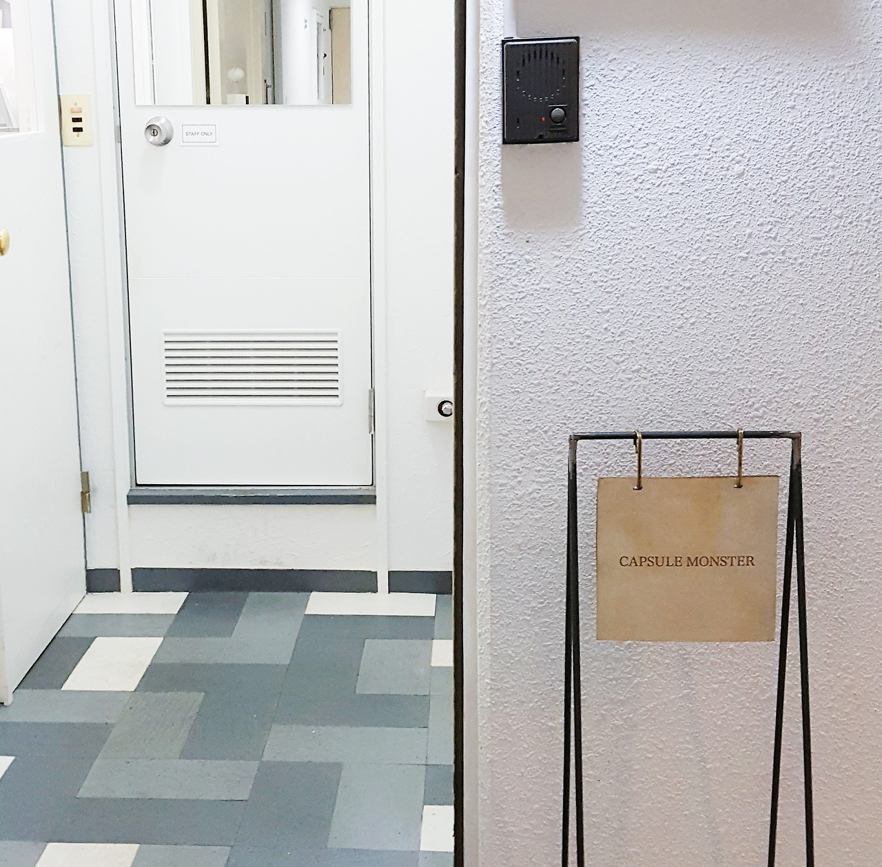 복도를 두리번거리고 있던 차에 반갑게도 철제문을 열어 둔 가게 하나를 발견했습니다. 503호의 과자 가게, <캡슐 몬스터 Capsule Monster>입니다. 철문 안에는 나무틀로 만든 귀여운 유리문이 하나 더 달려 있었습니다. 아파트였다면 신발 벗는 구간을 막아주는 덧문이 있어야 할 자리인데, 여기에 가게의 프런트 도어를 설치한 것입니다. 유리문 너머 심플한 디자인으로 공간을 꾸민 가게가 보입니다. 제대로 찾아왔구나, 여기서 안심. 철문 하나 열어뒀을 뿐인데 아파트 복도의 메마른 풍경이 따스하게 바뀌는 기분이었습니다.