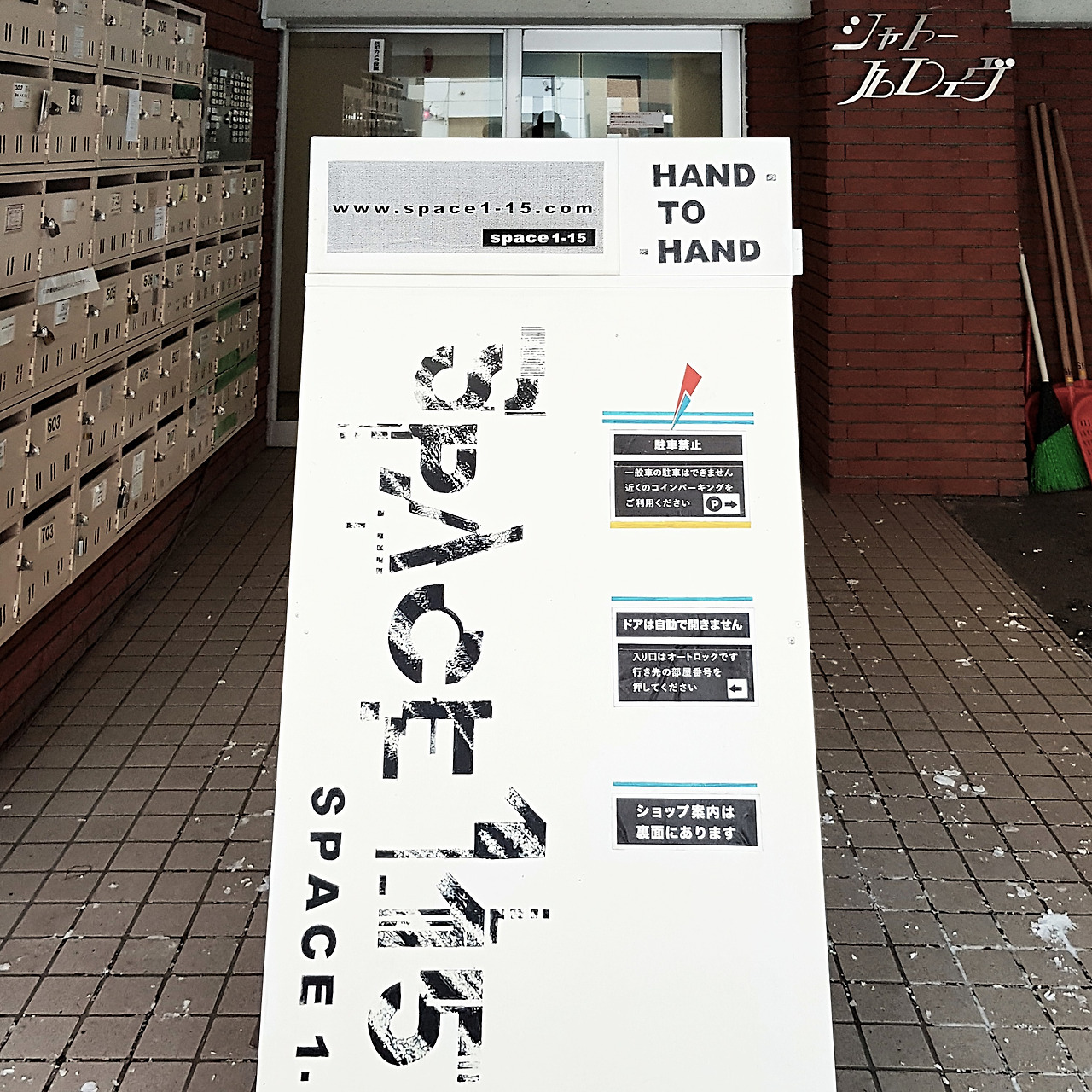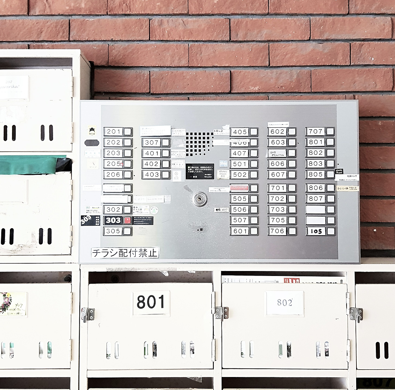 결론부터 말하자면, 스페이스 이치이치고는 8층 규모의 복도형 아파트를 작은 가게들의 모임으로 바꾼 건물입니다. 안으로 들어서면 독특한 가게들이 벌집처럼 옹기종기 모여 영업 중입니다. 그런데 들어가는 방법이 독특합니다. 정문에는 어디서나 흔히 볼 수 있는 아파트 초인종이 있습니다. 방 번호와 작은 버튼들이 좌르륵 붙어있는 인터폰 말입니다. 흥미롭게도, 이 작은 방 하나하나가 가게입니다. 501호는 과자가게, 502호는 꽃가게, 이런 식으로요. 그러니 그 가게에 가고 싶으면 해당 번호를 누르고 1층 출입구의 문이 열리기를 기다려야 합니다.