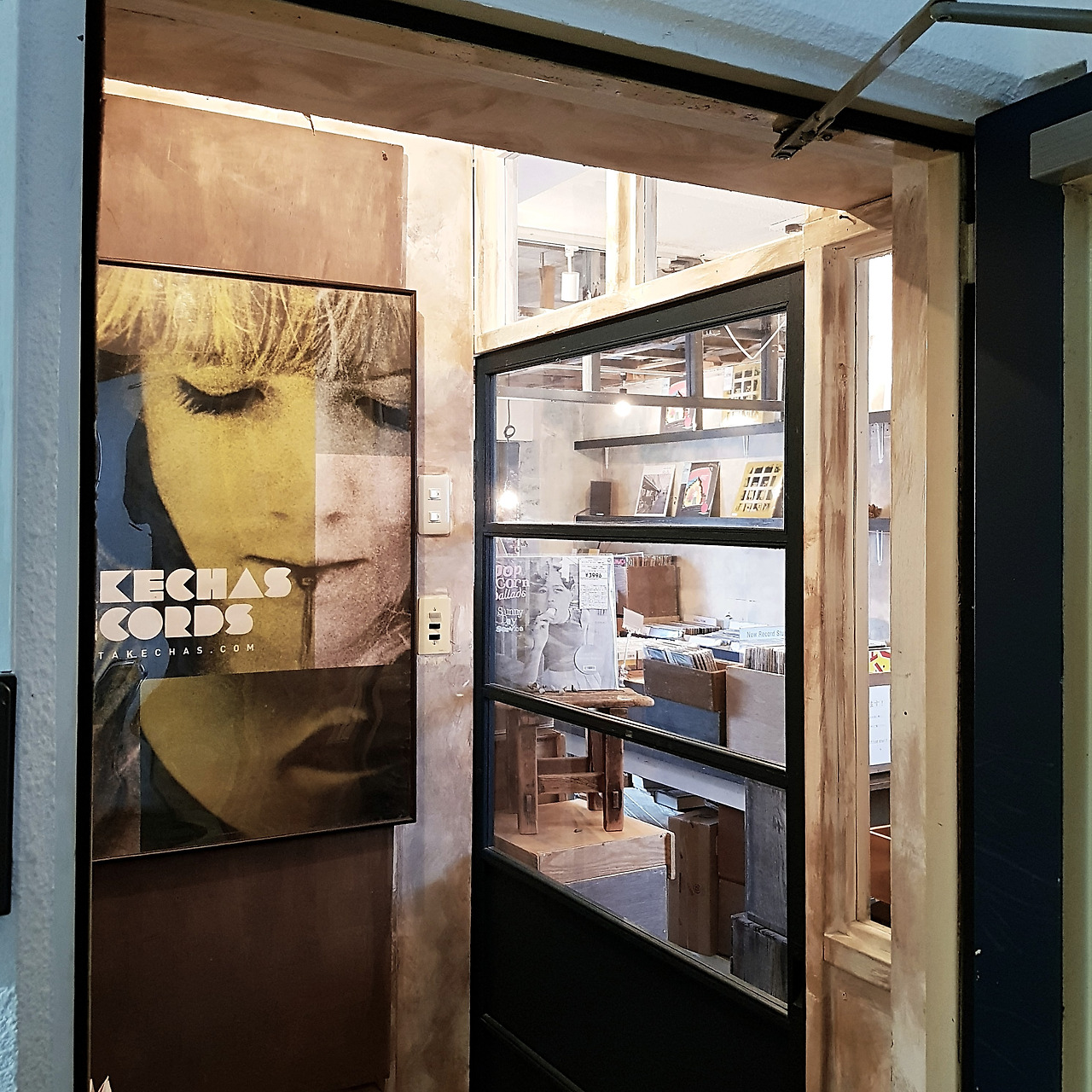 역시 철제문을 열어 두고 감각 넘치는 포스터와 소품들로 입구를 꾸며둔 가게를 발견했습니다. 방 안에 들어서자 따스한 음악이 흐르고 나무 책장에 LP 레코드 판들이 잔뜩 꽂혀 있습니다. 손님 한 분이 헌팅캡을 쓴 사장님과 레코드를 살펴보며 이야기를 나누고 있습니다. <타케차스 레코즈 Takechas Records>입니다.