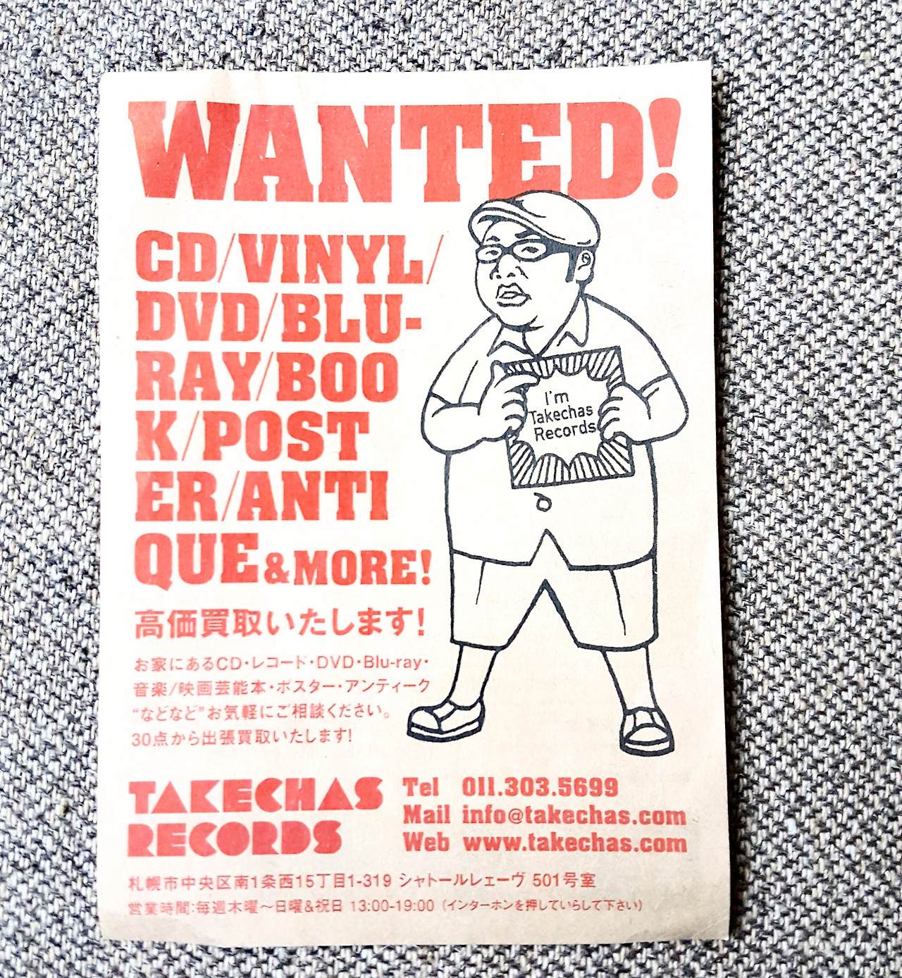 5년 넘게 온라인 숍으로 LP 레코드를 취급하던 주인, 타케차스 씨는 '은둔형 레코드 살롱'을 컨셉트로 내세우고 이곳에 자신의 오프라인 가게를 만들었습니다. 자신이 보유한 2만 장의 레코드 중 일부를 옮겨와서, 매주 테마를 바꿔가며 501호의 방에 진열합니다. 가게에 있는 물건들은 온라인에서도 구입 가능하지만 '타케차스 씨가 이번 주에는 어떤 테마로 진열했을까', 호기심을 품고 이곳까지 오게 될 것 같습니다. 홍보 팸플릿의 만화 캐릭터와 똑같이 생긴 사장님과 금주의 테마에 대해 이야기 나누는 것도 즐거움일 테고요.
