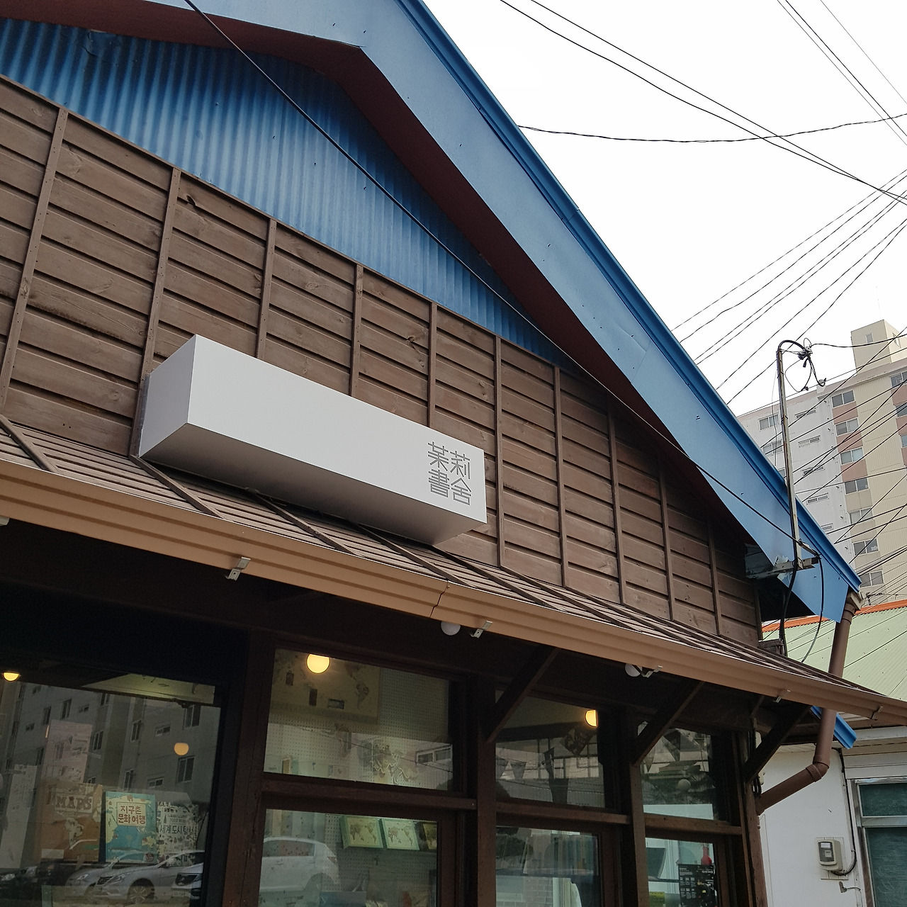 분필로 글씨를 쓴 입간판 옆에는 귀여운 풀 화분이 놓여 있습니다. 책방이 들어선 곳은 나무로 지은 단층집입니다. 판자를 이어 붙인 벽 위에 파란색 경사 지붕이 얹혀있는데, '어디선가 본 듯?'하는 생각이 드는, 친근하고 소박한 모습입니다.