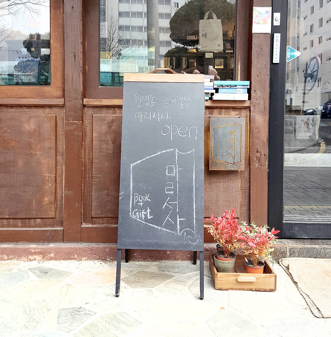 마리서사라는 이름의 의미를 물어보니, 1940년대 시인 박인환이 운영했던 서점의 이름에서 따왔다고 합니다. '서사 書舍'는 서점이라는 뜻이고, 마리는 프랑스의 예술가 이름이라고 하네요. 아, 시인이 서점을 운영하던 낭만적인 시절이 있었군요.