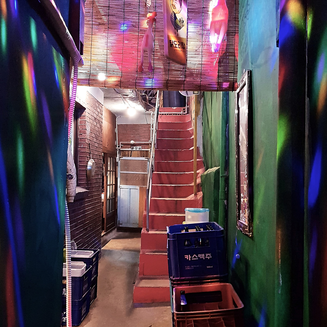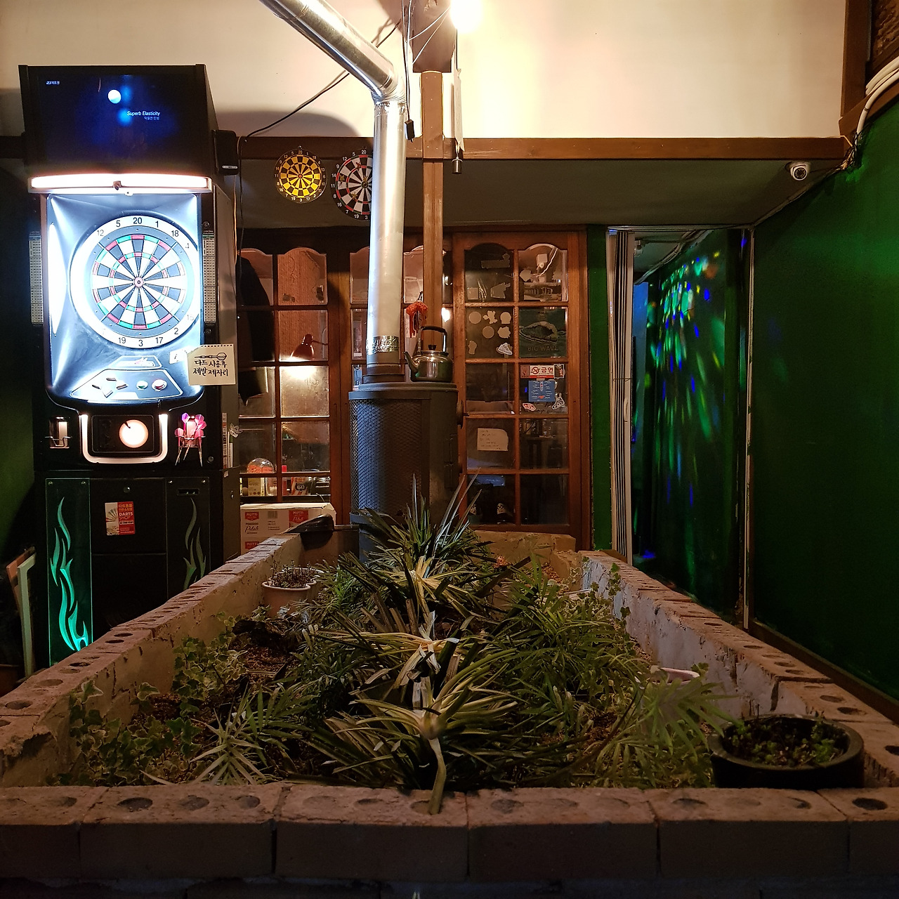 천장에는 울긋불긋 조명이 달려 있고, 자개로 만든 테이블에는 막걸리와 소주병들이 널려습니다. 아, 자세히 보니 자개 테이블이 아닙니다. 자개 문양을 종이에 인쇄해서 붙인, 무늬만 자개인 테이블입니다. 별난 취향이지만 섬세하게 꾸몄습니다.