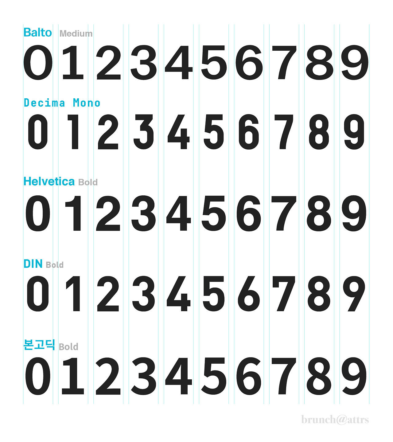 이번엔 동시에 나열해봤다. Vox에서 사용한 Balto, FiveThirtyEight에서 사용한 Decima mono와 많이 쓰이는 Helvetica, DIN, 그리고 한글을 지원하는 본고딕을 비교했다. (The Upshot은 NYT 전용 폰트를 테스트할 수 있는 사이트를 찾을 수 없었다.**)