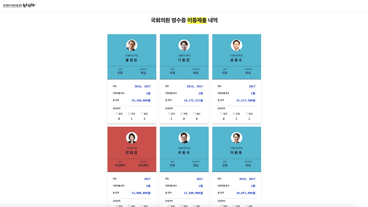 사용한 금액을 중앙선거관리위원회와 국회에 이중 제출해 비용을 이중으로 받은 의원들의 명단을 페이지로 만들었다. 영수증 콘셉트로 정당에 따라 색을 분류하고, 금액과 데이터를 숫자로 표기했다.
