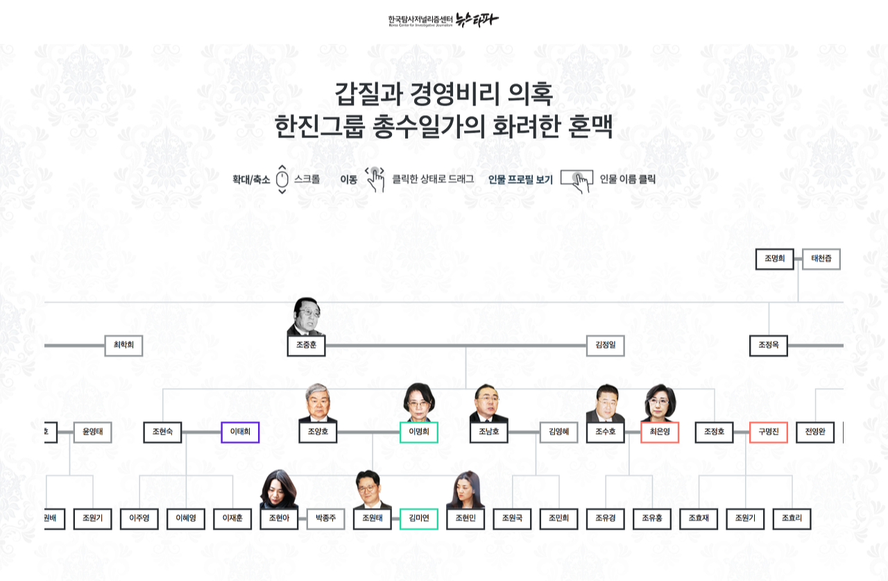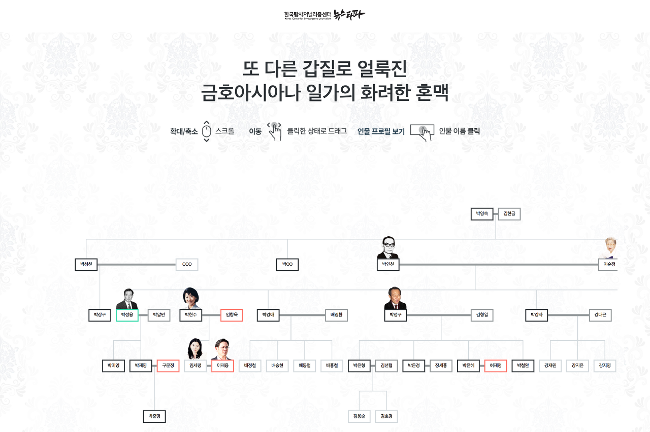 뉴스타파에 와서 가장 먼저 만든 시리즈. 그리고 구현할 때 가장 고생한 시리즈. 재벌, 대법관 등 권력을 가진 이들이 결혼을 통해 어떻게 권력을 공고히 했는지 추적하는 프로젝트였다.