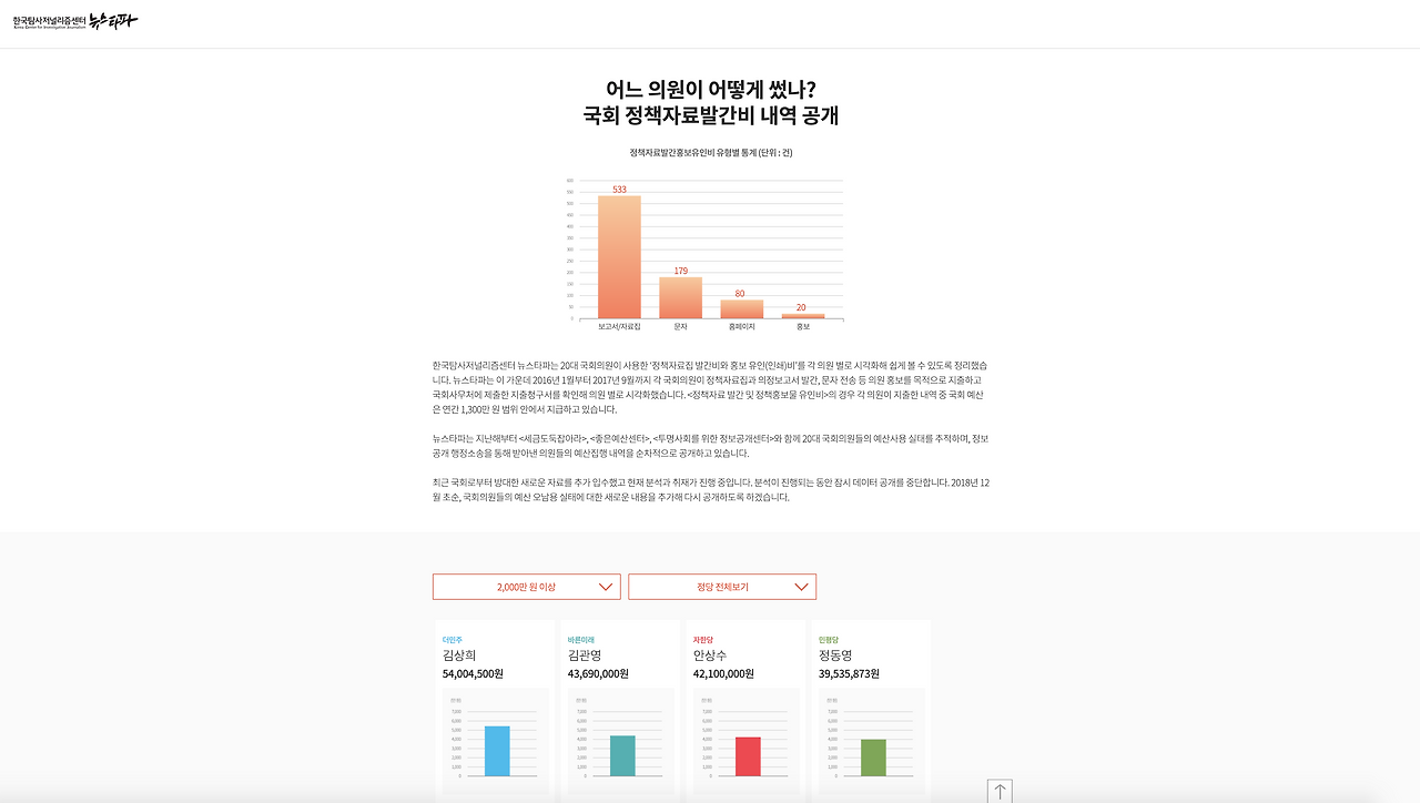 국회 정책자료 발간비 내역 공개 페이지는 20대 국회의원들의 정책자료 발간비 사용내역을 시각화한 페이지다. 의원별로 흩어진 내역을 정리하고, 총액을 막대그래프로 표현했다. 총액 별로, 정당별로 의원을 분류해 볼 수 있다.