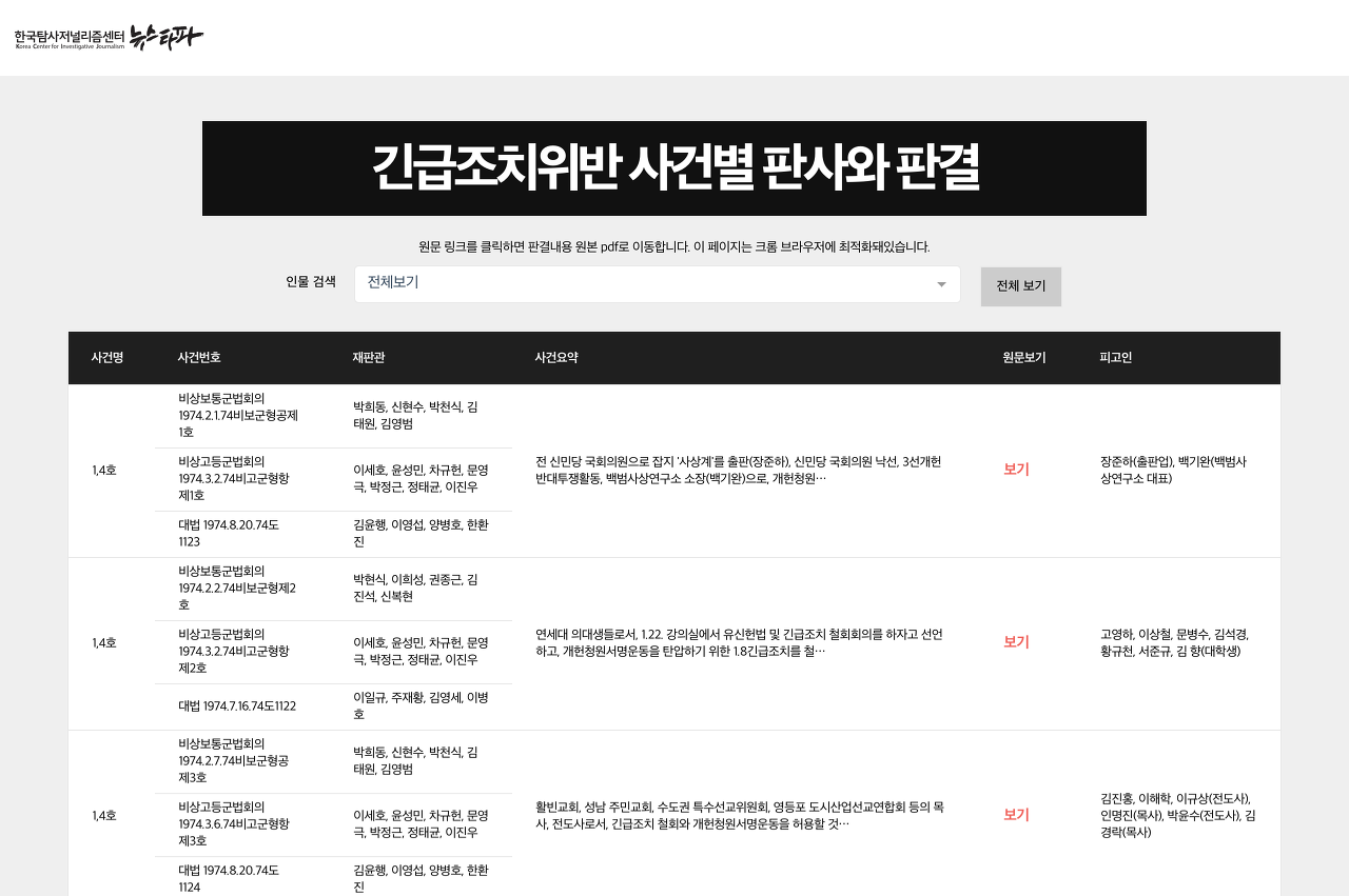 긴급조치 위반 판결 리스트는 긴급조치 위반 판결에 참여한 판사들과 판결 내용을 정리한 페이지다. 판사 이름을 검색할 수 있고 판결문 원문도 볼 수 있다.