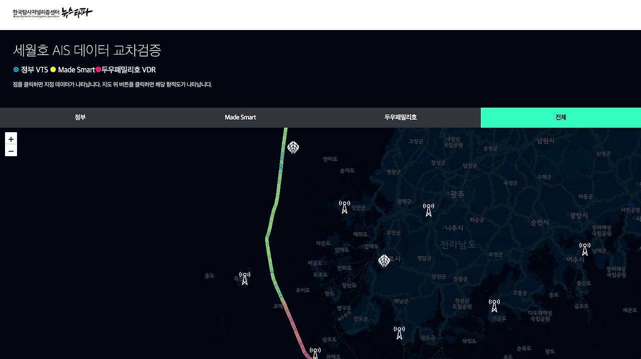 영화 '그날 바다'에서 말한 내용을 여러 데이터로 검증했던 기사. 정부 항적 데이터, 외국에서 구매한 데이터, 두우 패밀리호의 항적을 각각 지도로 만들어 동시에 겹쳐보며 데이터를 비교해볼 수 있도록 했다.