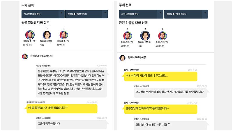원래 어플에서는 한 명의 인물과 대화한 메시지가 하나의 창에 모두 나타난다. 하지만 이 문자들은 1번 사람에게 부탁하거나 받은 내용을 2번에게 전달한 후 다시 1번에게 연락하는 형태처럼 여러 인물과 맥락이 얽혀있었다. 그래서 각 인물과의 대화를 맥락에 맞게 순서대로 보여줘야 했다. 그래서 대화를 맥락에 따라 분리해 순서를 매겨 나타냈다. 그리고 상대방의 메시지는 왼쪽 노란 말풍선, 박수환 대표가 보낸 메시지는 오른쪽 회색 말풍선으로 구분해 직관적으로 화자를 분리해서 인식할 수 있도록 했다.