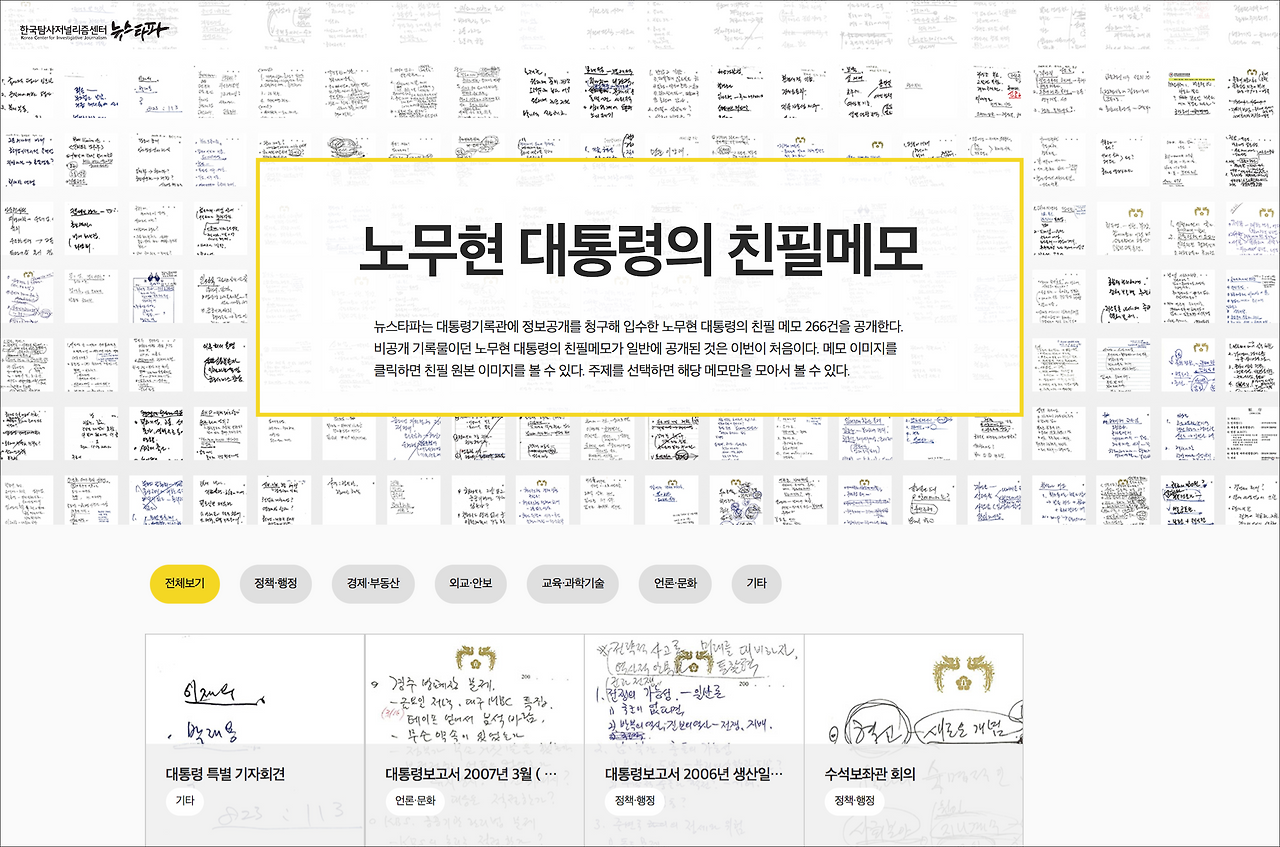 뉴스타파는 고 노무현 전 대통령이 재임 시절 직접 쓴 메모 266건을 공개했다. 대통령 취임 초인 2003년부터 퇴임 열흘 전인 2008년 2월 15일까지 작성된 메모들로 총 799 페이지 분량이다. 이 메모들은 대통령이 만찬, 기자간담회, 업무보고 등 재임 일정을 소화하면서 떠오른 단상들을 기록한 메모다.